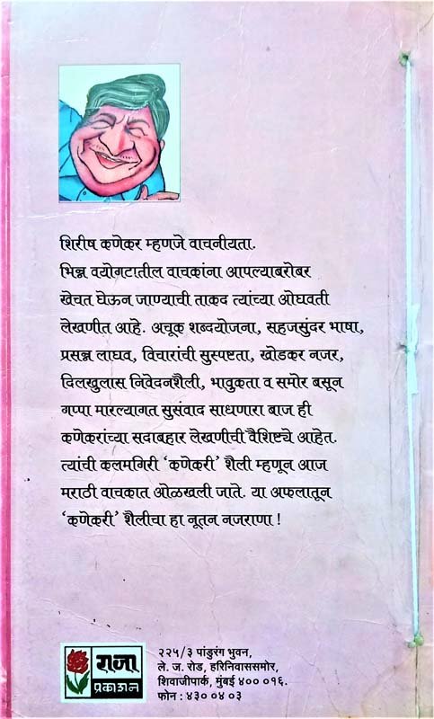 शिरीष कणेकर म्हणजे वाचनीयता. भिन्न वयोगटातील वाचकांना आपल्याबरोबर खेचत घेऊन जाण्याची ताकद त्यांच्या ओघवती लेखणीत आहे. अचूक शब्दयोजना, सहजसुंदर भाषा, प्रसन्न लाघव, विचारांची सुस्पष्टता, खोडकर नजर, दिलखुलास निवेदनशैली, भावुकता व समोर बसून गप्पा मारल्यागत सुसंवाद साधणारा बाज ही कणेकरांच्या सदाबहार लेखणीची वैशिष्ट्ये आहेत. त्यांची कलमगिरी ‘कणेकरी’ शैली म्हणून आज मराठी वाचकात ओळखली जाते. या अफलातून ‘कणेकरी’ शैलीचा हा नूतन नजराणा !