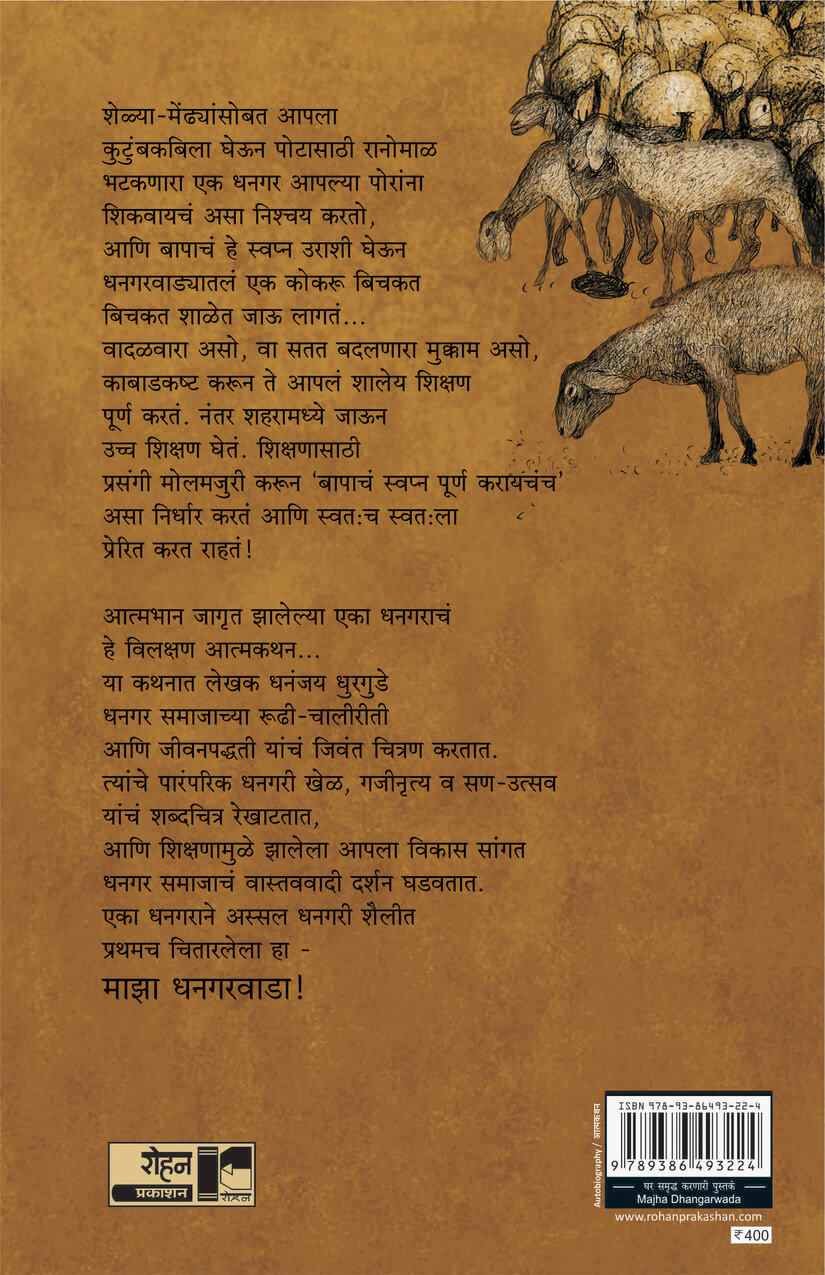 शेळ्या-मेंढ्यांसोबत आपला कुटुंबकबिला घेऊन पोटासाठी रानोमाळ भटकणारा एक धनगर आपल्या पोरांना शिकवायचं असा निश्चय करतो, आणि बापाचं हे स्वप्न उराशी घेऊन धनगरवाड्यातलं एक कोकरू बिचकत बिचकत शाळेत जाऊ लागतं... वादळवारा असो, वा सतत बदलणारा मुक्काम असो, काबाडकष्ट करून ते आपलं शालेय शिक्षण पूर्ण करतं. नंतर शहरामध्ये जाऊन उच्च शिक्षण घेतं. शिक्षणासाठी प्रसंगी मोलमजुरी करून ‘बापाचं स्वप्न पूर्ण करायचंच’ असा निर्धार करतं आणि स्वत:च स्वत:ला प्रेरित करत राहतं! आत्मभान जागृत झालेल्या एका धनगराचं हे विलक्षण आत्मकथन... या कथनात लेखक धनंजय धुरगुडे धनगर समाजाच्या रूढी-चालीरीती आणि जीवनपद्धती यांचं जिवंत चित्रण करतात. त्यांचे पारंपरिक धनगरी खेळ, गजीनृत्य व सण-उत्सव यांचं शब्दचित्र रेखाटतात, आणि शिक्षणामुळे झालेला आपला विकास सांगत धनगर समाजाचं वास्तववादी दर्शन घडवतात. एका धनगराने अस्सल धनगरी शैलीत प्रथमच चितारलेला हा – माझा धनगरवाडा!