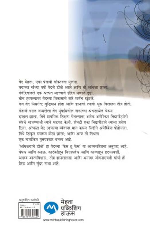 वेद मेहता, एका पंजाबी डॉक्टरचा मुलगा. वयाच्या चौथ्या वर्षी वेदचे डोळे आले आणि तो आंधळा झाला. पंचेंद्रियांतले एक अत्यंत महत्त्वाचे इंद्रिय म्हणजे दृष्टी. तीच हरपल्यावर वेदच्या विकासाचे सारे मार्गच खुंटले. पण वेद निसर्गत: बुद्धिमान होता आणि ज्ञानाची त्याची भूक विलक्षण तीव्र होती. पंजाबी घरात जन्मलेला वेद मुंबईमधील दादरच्या अंधशाळेत येऊन दाखल झाला. तिथे प्राथमिक शिक्षण घेतल्यावर अनेक अमेरिकन विद्यापीठांशी संपर्क साधण्याची त्याने धडपड केली. शेवटी एका विद्यापीठाने त्याला प्रवेश दिला. आंधळा वेद आपल्या व्यंगावर मात करून जिद्दीने अमेरिकेत पोहोचला. तिथे शिकून सवरून मोठा झाला; आणि आज तो तिथला एक नामांकित वृत्तपत्रकार बनला आहे. ‘आंधळ्याचे डोळे’ हा वेदच्या ‘फेस टु फेस’ या आत्मचरित्राचा अनुवाद आहे. वेधक आणि रसाळ. कादंबरीहून चित्ताकर्षक आणि काव्याहून हृदयस्पर्शी. अदम्य आत्मविश्वास, तीव्र ज्ञानलालसा आणि अनावर जीवनासक्ती यांची ही प्रेरक आणि सुंदर गाथा आहे.