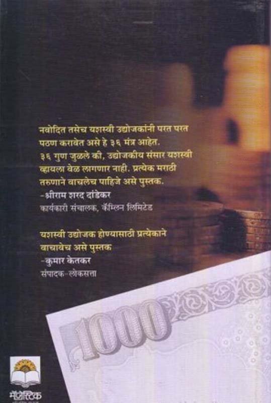 नवोदित तसेच यशस्वी उद्योजकांनी परत परत पठण करावेत असे हे 36 मंत्र आहेत. 36 गुण जुळले की, उदयोजकीय संसार यशस्वी व्हायला वेळ लागणार नाही. प्रत्येक मराठी तरूणाने वाचलेच पाहिजे असे पुस्तक.