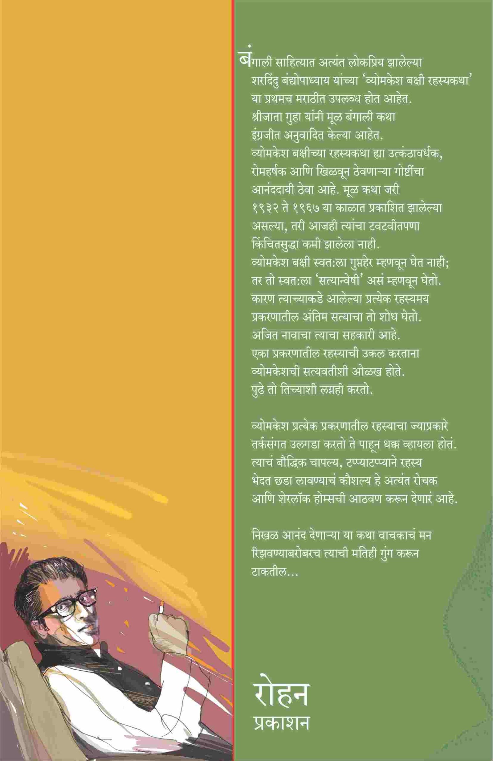 बंगाली साहित्यात अत्यंत लोकप्रिय झालेल्या शरदिंदु बंद्योपाध्याय यांच्या ‘व्योमकेश बक्षी रहस्यकथा' या प्रथमच मराठीत उपलब्ध होत आहेत. श्रीजाता गुहा यांनी मूळ बंगाली कथा इंग्रजीत अनुवादित केल्या आहेत. व्योमकेश बक्षीच्या रहस्यकथा ह्या उत्कंठावर्धक, रोमहर्षक आणि खिळवून ठेवणार्या गोष्टींचा आनंददायी ठेवा आहे. मूळ कथा जरी १९३२ ते १९६७ या काळात प्रकाशित झालेल्या असल्या, तरी आजही त्यांचा टवटवीतपणा विंâचितसुद्धा कमी झालेला नाही. व्योमकेश बक्षी स्वत:ला गुप्तहेर म्हणवून घेत नाही; तर तो स्वत:ला ‘सत्यान्वेषी' असं म्हणवून घेतो. कारण त्याच्याकडे आलेल्या प्रत्येक रहस्यमय प्रकरणातील अंतिम सत्याचा तो शोध घेतो. अजित नावाचा त्याचा सहकारी आहे. एका प्रकरणातील रहस्याची उकल करताना व्योमकेशची सत्यवतीशी ओलख होते. पुढे तो तिच्याशी लग्नही करतो. व्योमकेश प्रत्येक प्रकरणातील रहस्याचा ज्याप्रकारे तर्कसंगत उलगडा करतो ते पाहून थक्क व्हायला होतं. त्याचं बौद्धिक चापल्य, टप्प्याटप्प्याने रहस्य भेदत छडा लावण्याचं कौशल्य हे अत्यंत रोचक आणि शेरलॉक होम्सची आठवण करून देणारं आहे. निखळ आनंद देणार्या या कथा वाचकाचं मन रिझवण्याबरोबरच त्याची मतीही गुंग करून टाकतील!
