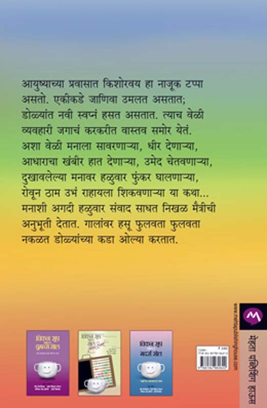 आयुष्याच्या प्रवासात किशोरवय हा नाजूक टप्पा असतो. एकीकडे जाणिवा उमलत असतात; डोळ्यांत नवी स्वप्नं हसत असतात. त्याच वेळी व्यवहारी जगाचं करकरीत वास्तव समोर येतं. अशा वेळी मनाला सावरणाया, धीर देणाया, आधाराचा खंबीर हात देणाया, उमेद चेतवणाया, दुखावलेल्या मनावर हळुवार फुंकर घालणाया, रोवून ठाम उभं राहायला शिकवणाया या कथा... मनाशी अगदी हळुवार संवाद साधत निखळ मैत्रीची अनुभूती देतात. गालांवर हसू फुलवता फुलवता नकळत डोळ्यांच्या कडा ओल्या करतात.