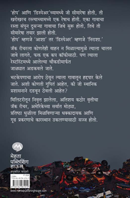 ‘होप’ आणि ‘डिस्पेअर’च्यामध्ये जी सीमारेषा होती, ती खरोखरच रस्त्याच्यामध्ये एक रेषाच होती. एका गावाचा रस्ता संपून दुसNया गावाचा जिथे सुरू होतो, तिथे ती सीमारेषा तयार झाली होती. ‘होप’ म्हणजे ‘आशा’ तर ‘डिस्पेअर’ म्हणजे ‘निराशा.’ जॅक रीचरला कोणतेही वाहन न मिळाल्यामुळे त्याला चालत जावे लागते, फक्त एक कप कॉफी साठी. पण त्याला रेस्टॉरंटमध्ये आलेल्या चौकडीमार्पÂत जाळ्यात अडकवले जाते. चूक... चूक... चूक... ते चुकीच्या माणसाला धरतात. जॅक रीचर हा त्याच्या क्षेत्रात मोठा असतो कामधंदा नसलेला, कायमस्वरूपी पत्ता नसलेला, सामानसुमान नसलेला फक्त मनस्वी जिज्ञासू. भटकेपणाचा आरोप ठेवून त्याला गावातून हद्दपार केले जाते. अशी कोणती गुपितं आहेत की जी स्थानिक प्रशासनाने दडवून ठेवली आहेत? मिलिटरीतून निवृत्त झालेला अतिशय कठोर वृत्तीचा जॅक रीचर हे नाजूक धागे पकडून अमेरिकेच्या सर्वात मोठ्या प्रतिष्ठा धुळीला मिळविणा-या धक्कादायक आणि गूढ प्रकरणाचे कारस्थान उकलण्यासाठी सज्ज होतो. कारण काहीही झालं तरी जॅक रीचरला काहीच गमवावं लागणार नव्हतं. एक रहस्यमय थरारकथा म्हणून या पुस्तकाकडे बघता बघता त्या वाटेने सुरू झालेला प्रवास देशभक्ती, कडवे धर्मवेड अशा अनेक भावनांपाशी, आग्रहांपाशी येऊन थांबतो. कोणतीही गोष्ट जेव्हा अतिरेकाकडे झुकते तेव्हा ती दुराग्रहामध्ये रूपांतरित होते. या दुराग्रहांचे, माथेफिरू धर्मवेडाचे जे दर्शन या पुस्तकात घडते ते भयचकित करणारे आहे. त्यामुळे हे पुस्तक केवळ एक रहस्यमय थरारकथा राहात नाही; तर ते मानवी प्रवृत्तींना आव्हान देत राहते.