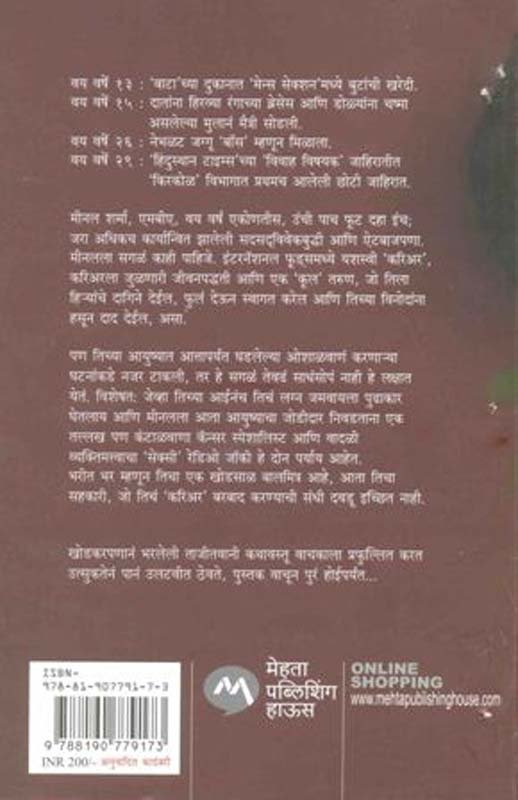 वय वर्षे 13 : 'बाटा'च्या दुकानात 'मेन्स सेक्शन'मध्ये बुटांची खरेदी. वय वर्षे 15 : दातांना हिरव्या रंगाच्या ब्रेसेस आणि डोळ्यांना चष्मा असलेल्या मुलानं मैत्री सोडली. वय वर्षे 26 : नेभळट जग्गू 'बॉस' म्हणून मिळाला. वय वर्षे 29 : 'हिंदुस्थान टाइम्स'च्या 'विवाह विषयक' जाहिरातीत 'किरकोळ' विभागात प्रथमच आलेली छोटी जाहिरात. मीनल शर्मा, एमबीए, वय वर्षं एकोणतीस, उंची पाच फूट दहा इंच; जरा अधिकच कार्यान्वित झालेली सदसद्विवेकबुद्धी आणि ऐटबाजपणा. मीनलला सगळं काही पाहिजे. इंटरनॅशनल फूड्समध्ये यशस्वी 'करिअर', करिअरला जुळणारी जीवनपद्धती आणि एक 'कूल' तरुण, जो तिला हि-यांचे दागिने देईल, फुलं देऊन स्वागत करेल आणि तिच्या विनोदांना हसून दाद देईल, असा. पण तिच्या आयुष्यात आत्तापर्यंत घडलेल्या ओशाळवाणं करणा-या घटनांकडे नजर टाकली, तर हे सगळं तेवढं साधंसोपं नाही हे लक्षात येतं. विशेषत: जेव्हा तिच्या आईनंच तिचं लग्न जमवायला पुढाकार घेतलाय आणि मीनलला आता आयुष्याचा जोडीदार निवडताना एक तल्लख पण कंटाळवाणा कॅन्सर स्पेशालिस्ट आणि वादळी व्यक्तिमत्त्वाचा 'सेक्सी' रेडिओ जॉकी हे दोन पर्याय आहेत. भरीत भर म्हणून तिचा एक खोडसाळ बालमित्र आहे, आता तिचा सहकारी, जो तिचं 'करिअर' बरबाद करण्याची संधी दवडू इच्छित नाही. खोडकरपणानं भरलेली ताजीतवानी कथावस्तू वाचकाला प्रफुल्लित करत उत्सुकतेनं पानं उलटवीत ठेवते, पुस्तक वाचून पुरं होईपर्यंत...