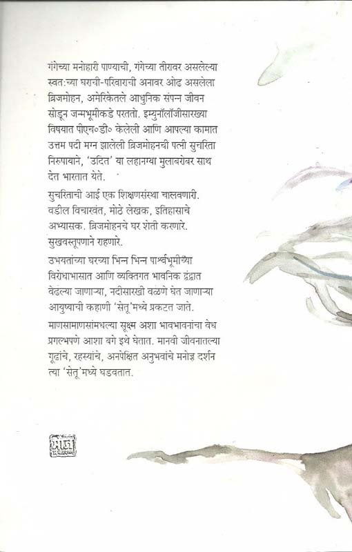 गंगेच्या मनोहारी पाण्याची, गंगेच्या तीरावर असलेल्या स्वत:च्या घराची परिवाराची अनावर ओढ असलेला ब्रिजमोहन, अमेरिकेतले आधुनिक संपन्न जीवन सोडून जन्मभूमीकडे परततो. इम्युनॉलॉजीसारख्या विषयात पी.डी. केलेली आणि आपल्या कामात उत्तम पदी मग्न झालेली ब्रिजमोहनाची पत्नी सुचारिता निरूपायाने, ’उदित’ या लहानग्या मुलाबरोबर साथ देत भारतात येते. सुचरिताची आई एक शिक्षणसंस्था चालवणारी. वडील विचारवंत, मोठे लेखक, इतिहासाचे अभ्यासक. ब्रिजमोहनाचे घर शेती करणारे. सुखवस्तूपणाने राहणारे. उभयतांच्या घरच्या भिन्न-भिन्न पाश्र्वभूमीच्या विरोधाभासात आणि व्यक्तिगत भावनिक व्दंव्दात वेढल्या जाणा-या, नदीसारखी वळणे घेत जाणा-या आयुष्याची कहाणी ’सेतू’मध्ये प्रकटत जाते. माणसामाणसांमधल्या सूक्ष्म अशा भावभावनांचा वेध प्रगल्भपणे आशा बगे इथे घेतात. मान्वी जीवनातल्या गूढांचे, रहस्यांचे, अनपेक्षित अनुभवांचे मनोज्ञ दर्शन त्या ’सेतू’मध्ये घडवतात.