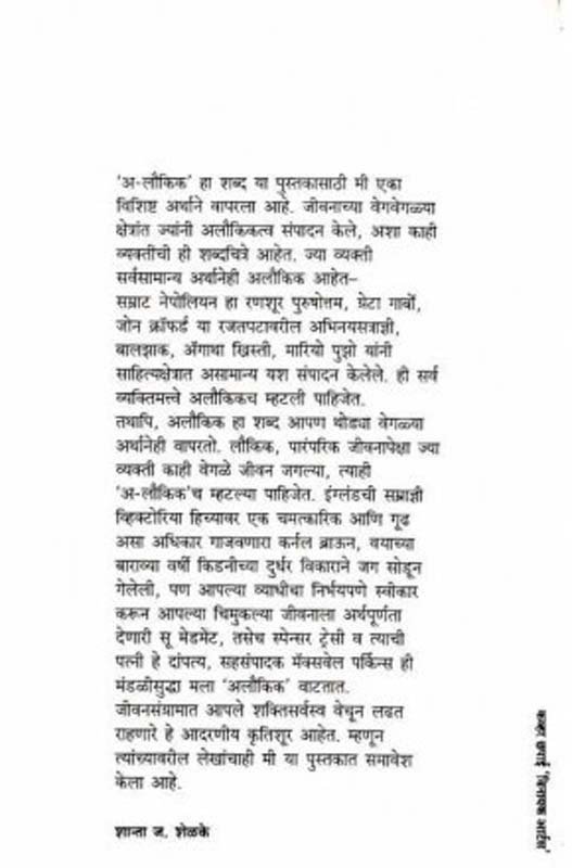 ‘अ-लौकिक’ हा शब्द या पुस्तकासाठी मी एका विशिष्ट अर्थाने वापरला आहे. जीवनाच्या वेगवेगळ्या क्षेत्रांत ज्यांनी अलौकिकत्व संपादन केले, अशा काही व्यक्तींची ही शब्दचित्रे आहेत. ज्या व्यक्ती सर्वसामान्य अर्थानेही अलौकिक आहेत - सम्राट नेपोलियन हा रणशूर पुरुषोत्तम, ग्रेटा गार्बो, जोन क्रॉफर्ड या रजतपटावरील अभिनयसत्राज्ञी, बालझाक, अॅगाथा ख्रिस्ती, मारियो पुझो यांनी साहित्यक्षेत्रात असामान्य यश संपादन केलेले. ही सर्व व्यक्तिमत्त्वे अलौकिकच म्हटली पाहिजेत. तथापि, अलौकिक हा शब्द आपण थोड्या वेगळ्या अर्थानेही वापरतो. लौकिक, पारंपरिक जीवनापेक्षा ज्या व्यक्ती काही वेगळे जीवन जगल्या, त्याही ‘अ-लौकिक’च म्हटल्या पाहिजेत. इंग्लंडची सम्राज्ञी व्हिक्टोरिया हिच्यावर एक चमत्कारिक आणि गूढ असा अधिकार गाजवणारा कर्नल ब्राऊन, वयाच्या बाराव्या वर्षी किडनीच्या दुर्धर विकाराने जग सोडून गेलेली, पण आपल्या व्याधीचा निर्भयपणे स्वीकार करून आपल्या चिमुकल्या जीवनाला अर्थपूर्णता देणारी सू मेडमेंट, तसेच स्पेन्सर ट्रेसी व त्याची पत्नी हे दांपत्य, सहसंपादक मॅक्सवेल पर्किन्स ही मंडळीसुध्दा मला ‘अलौकिक’ वाटतात. जीवनसंग्रामात आपले शक्तिसर्वस्व वेचून लढत राहणारे हे आदरणीय कृतिशूर आहेत. म्हणून त्यांच्यावरील लेखांचाही मी या पुस्तकात समावेश केला आहे.
