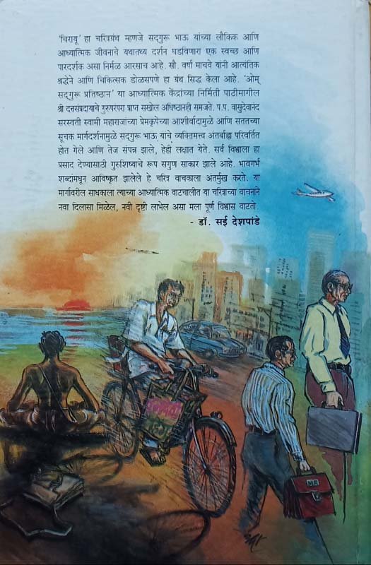 चिरायू' हा चरित्रग्रंथ म्हणजे सद्गुरू भाऊ यांच्या लौकिक आणि आध्यात्मिक जीवनाचे यथातथ्य दर्शन घडविणारा एक स्वच्छ आणि पारदर्शक असा निर्मळ आरसाच आहे. सौ. वर्षा माचवे यांनी आ आत्यंतिक श्रद्धेने आणि चिकित्सक डोळसपणे हा ग्रंथ सिद्ध केला आहे. ओम सद्गुरू प्रतिष्ठान' या आध्यात्मिक केंद्राच्या निर्मिती पाठीमागील श्री दत्तसंप्रदायाचे गुरुपरंपरा प्राप्त सखोल अधिष्ठानही समजते. प. प. वासुदेवानंद सरस्वती स्वामी महाराजांच्या प्रेमकृपेच्या आशीर्वादामुळे आणि सततच्या सूचक मार्गदर्शनामुळे सद्गुरू भाऊ यांचे व्यक्तिमत्व अंतर्बाह्य परिवर्तित होत गेले आणि तेज संपन्न झाले, हेही लक्षात येते. सर्व विश्वाला हा प्रसाद देण्यासाठी गुरुशिष्याचे रूप सगुण साकार झाले आहे. भावगर्भ शब्दामधून अविष्कृत झालेले हे चरित्र वाचकाला अंतर्मुख करते. या मार्गावरील साधकाला त्याच्या आध्यात्मिक वाटचालीत या चरित्राच्या वाचनाने नवा दिलासा मिळेल, नवी दृष्टी लाभेल असा मला पूर्ण विश्वास वाटतो.- डॉ . सई देशपांडे