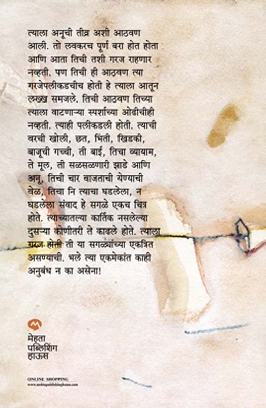 त्याला अनूची तीव्र अशी आठवण आली. तो लवकरच पूर्ण बरा होत होता आणि आता तिची तशी गरज राहणार नव्हती. पण तिची ही आठवण त्या गरजेपलीकडचीच होती हे त्याला आतून लख्ख समजले. तिची आठवण तिच्या त्याला वाटणाऱ्या स्पर्शाच्या ओढीचीही नव्हती. त्याही पलीकडली होती. त्याची वरची खोली, छत, भिंती , खिडकी, बाजूची गच्ची, ती बाई, तिचा व्यायाम, ते मूल, ती सळसळणारी झाडे आणि अनू, तिची चार वाजताची येण्याची वेळ, तिचा नि त्याचा घडलेला, न घडलेला संवाद हे सगळे एकच चित्र होते. त्याच्यातल्या कार्तिक नसलेल्या दुसऱ्या कोणीतरी ते काढले होते. त्याला गरज होती ती या सगळ्यांच्या एकत्रित असण्याची. भले त्या एकमेकांत काही अनुबंध न का असेना!
