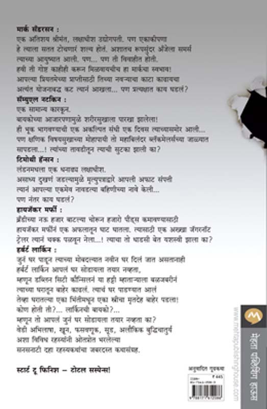 मार्क सँडरसन : एक अतिशय श्रीमंत, लक्षाधीश उद्योगपती. पण एकाकीपणा हे त्याला सतत टोचणारं शल्य होतं. अशातच रूपसुंदर अँजेला समर्स त्याच्या आयुष्यात आली. पण... पण ती विवाहीत होती. हवी ती गोष्ट काहीही करून मिळवायचीच हा मार्कचा स्वभाव! आपल्या प्रियतमेच्या प्राप्तीसाठी तिच्या नव-याचा काटा काढायचा अत्यंत योजनाबद्ध कट त्यानं आखला... पण प्रत्यक्षात काय घडलं? सॅम्युएल नटकिन : एक सामान्य कारकून. बायकोच्या आजारपणामुळे शरीरसुखाला पारखा झालेला! ही भूक भागवण्याची एक अकल्पित संधी एक दिवस त्याच्यासमोर आली... पण क्षणिक विषयसुखाच्या मोहापायी तो महाबिलंदर ब्लॅकमेलर्सच्या जाळ्यात सापडला...! त्यांच्या तावडीतून त्याची सुटका झाली का? टिमोथी हॅन्सन : लंडनमधला एक धनाढ्य लक्षाधीश. असाध्य दुखणं जडल्यामुळे मृत्युपत्राद्वारे आपली अफाट संपत्ती त्यानं आपल्या एकमेव नावडत्या बहिणीच्या नावे केली... पण नंतर काय घडलं? हायजॅकर मर्फी : ब्रँडीच्या नऊ हजार बाटल्या चोरून हजारो पौंड्स कमावण्यासाठी हायजॅकर मर्फीनं एक अफलातून घाट घातला. त्यासाठी एक अख्खा जॅगरनॉट ट्रेलर त्यानं चक्क पळवून नेला...! त्याचा तो धाडसी बेत यशस्वी झाला का? हर्बर्ट र्लािकन : जुनं घर पाडून त्याच्या मोबदल्यात नवीन घर दिलं जात असतानाही हर्बर्ट र्लािकन आपलं घर सोडायला तयार नव्हता, म्हणून डब्लिन सिटी कौन्सिलनं या हट्टी म्हाता-याला बळजबरीनं त्याच्या घरातून बाहेर काढलं. त्याचं घर पाडण्यात आलं तेव्हा घरातल्या एका भिंतीमधून एका स्त्रीचा मृतदेह बाहेर पडला! कोण होती ती?... र्लािकनची बायको?... म्हणून तो आपलं जुनं घर सोडायला तयार नव्हता का? वेडी अभिलाषा, खून, फसवणूक, सूड, अलौकिक बुद्धिचातुर्य अशा विविध रहस्यांनी ओतप्रोत भरलेल्या सनसनाटी दहा रहस्यकथांचा जबरदस्त कथासंग्रह. नो कमबॅक्स स्टार्ट टू फिनिश – टोटल सस्पेन्स!
