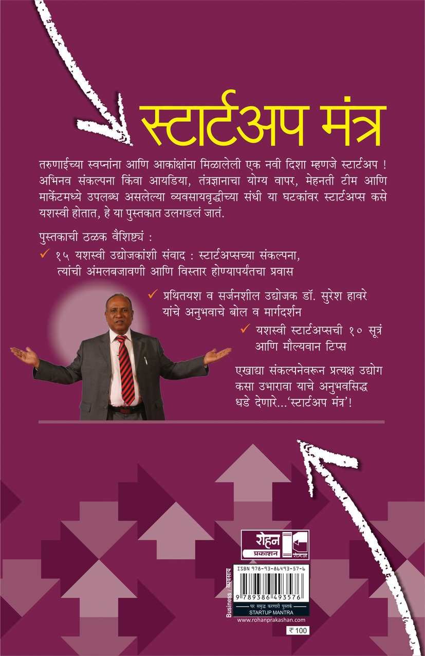 तरुणाईच्या स्वप्नांना आणि आकांक्षांना मिळालेली एक नवी दिशा म्हणजे स्टार्टअप! अभिनव संकल्पना किंवा आयडिया, तंत्रज्ञानाचा योग्य वापर, मेहनती टीम आणि मार्केटमध्ये उपलब्ध असलेल्या व्यवसायवृद्धीच्या संधी या घटकांवर स्टार्टअप्स कसे यशस्वी होतात, हे या पुस्तकात उलगडलं जातं. पुस्तकाची ठळक वैशिष्ट्यं : १५ यशस्वी उद्योजकांशी संवाद : स्टार्टअप्सच्या संकल्पना, त्यांची अंमलबजावणी आणि विस्तार होण्यापर्यंतचा प्रवास प्रथितयश व सर्जनशील उद्योजक डॉ. सुरेश हावरे यांचे अनुभवाचे बोल व मार्गदर्शन यशस्वी स्टार्टअप्सची १० सूत्रं आणि मौल्यवान टिप्स एखाद्या संकल्पनेवरून प्रत्यक्ष उद्योग कसा उभारावा याचे अनुभवसिद्ध धडे देणारे...‘स्टार्टअप मंत्र'!
