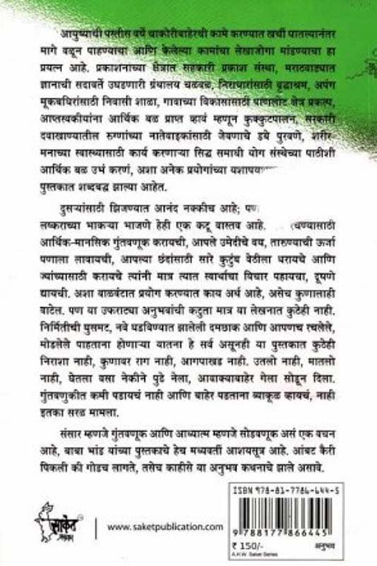 आयुष्याची पस्तीस वर्षे चाकोरीबाहेरची कामे करण्यात खर्ची घातल्यानंतर मागे वळून पाहण्याचा आणि केलेल्या कामांचा लेखाजोगा मांडण्याचा हा प्रयत्न आहे. प्रकाशनाच्या क्षेत्रात सहकारी प्रकाश संस्था, मराठवाड्यात ज्ञानाची सदावर्ते उघडणारी ग्रंथालय चळवळ, निधारांसाठी वृद्धांश्रम, अपंग मूकबधिरांसाठी निवासी शाळा, गावाच्या विकासासाठी पाणलोट क्षेत्र प्रकल्प, आप्तस्वकीयांना आर्थिक बळ प्राप्त व्हावं म्हणून कुक्कुटपालन, सरकारी दवाखाण्यातील रुग्णांच्या नातेवाईकांसाठी जेवणाचे डबे पुरवणे, शरीर मनाच्या स्वास्थासाठी कार्य करणार्या सिद्ध समाधी योग संस्थेच्या पाठीशी आर्थिक बळ उभं करणं, अशा अनेक प्रयोगांच्या यशापयशाच्या कहाण्या या पुस्तकात शब्दबद्ध झाल्या आहेत. दुसर्यांसाठी झिजण्यात आनंद नक्कीच आहे; पण समाजसेवा म्हणजे लष्कराच्या भाकर्या भाजणे हेही एक कटू वास्तव आहे. नवे रचण्यासाठी आर्थिक-मानसिक गुंतवणूक करायची, आपले उमेदीचे वय, तारुण्याची ऊर्जा पणाला लावायची, आपल्या छंदांसाठी सोरे कुटुंब वेठीला धरायचे आणि ज्यांच्यासाठी करायचे त्यांनी मात्र त्यात स्वार्थाचा विचार पहायचा, दूषणे द्यायची. अशा वाळवंटात प्रयोग करण्यात काय अर्थ आहे, असेच कुणालाही वाटेल. पण या उफराट्या अनुभवांची कटुता मात्र या लेखनात कुठेही नाही. निर्मितीची घुसमट, नवे घडविण्यात झालेली दमछाक आणि आपणच रचलेले, मोडलेले पाहताना होणार्या यातना हे सर्व असूनही या पुस्तकात कुठेही निराशा नाही, कुणावर राग नाही, आगपाखड नाही. उतलो नाही, मातलो नाही, घेतला वसा नेकीने पुढे नेला, आवाक्याबाहेर गेला सोडून दिला. गुंतवणुकीत कमी पडायचं नाही आणि बाहेर पडताना व्याकूळ व्हायचं, नाही इतका सरळ मामला. संसार म्हणजे गुंतवणूक आणि आध्यात्म म्हणजे सोडवणूक असं एक वचन आहे, बाबा भांड यांच्या पुस्तकाचे हेच मध्यवर्ती आशयसूत्र आहे. आंबट कैरी पिकली की गोडच लागले, तसेच काहीसे या अनुभव कथनाचे झाले असावे.