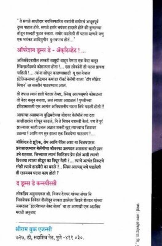 ’ते सगळं साक्षीदार भयविस्फारित नजरांनी समोरचं अभूतपूर्व दॄश्य पाहात होते. सगळे इतके भयंकर हादरले होते की कुणाच्या तोंडून शब्दही फुटत नव्हता. समोर घडलेली ती घटना म्हणजे जणु एक भयंकर आदियुगीन दु:स्वप्नच होतं...’ आपरेशन डूम्स डे - अकटिव्हेट!... अतिसंवेदनशील लष्करी सामुग्री वाहून नेणारा एक वेदर बलून स्वित्झर्लंडमधे कोसळला होता!... दहा लोकांनी ती घटना प्रत्यक्ष पाहिली!... त्यांना शोधून काढण्यासाठी यू एस नेव्हल इंटेलिजन्सचा बुद्धिमान कमांडर रॉबर्ट बेलॅमी याला ’टॉप सीक्रेट मिशन’ वर सक्तीनं पाठवण्यात आलं. तो तपास त्यानं हाती घेतला तेव्हा, स्विस आल्पसमध्ये कोसळला तो वेदर बलून नव्हता, असं त्याला आढळलं! पॄथ्वीच्या इतिहासातली एक अत्यंत अविश्वसनीय घटना तिथे घडली होती!! आपल्या असामान्य बुद्धिमत्तेच्या जोरावर बेलॅमीनं त्या दहा साक्षीदारांना शोधून काढलं, नि ते मिशन यशस्वी केलं. पण ते पुरं झाल्यावर काही प्रबल अज्ञात शद्ती खुद्द त्याच्याच जिवावर उठल्या! आणि मग सुरू झाला एक जिवघेणा पाठलाग!... वॉशिंग्टन ते झूरिक, रोम आणि पॅरिस अशा या चित्तथरारक प्रवासादरम्यान बेलॅमीचा जीवनपट उलगडत असताना काही प्रश्न उभे राहतात. जिच्यावर त्याचं निरतिशय प्रेम होतं अशी त्याची प्रियतमा त्याला सोडून का निघून गेली?... त्याचे अत्यंत निकटचे स्नेही त्याचे हाडवैरी का बनले?... स्विस आल्पस मधे घडलेली ती रहस्यमय घटना काय होती? द डूम्स डे कन्स्पीरसी लोकप्रिय अनुवादकार श्री. विजय देवधर यांच्या संपन्न नि चित्तवेधक निवेदन शैलीतून साकार झालेला सिडने शेल्डन यांच्या जबरदस्त ’इंटरनॅशनल बेस्ट सेलर’ चा हा आणखी एक अप्रतिम मराठी अनुवाद.`The Doomsday Conspiracy' is Marathi Translation of `The Doomsday Conspiracy' by Vijay Deodhar