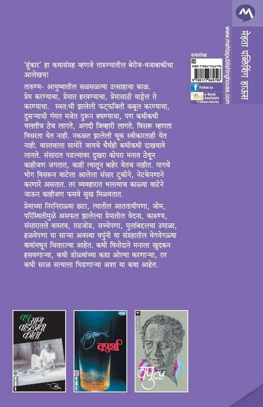 ‘हुंकार’ हा कथासंग्रह म्हणजे तारुण्यातील बेरीज-वजाबाकीचा आलेखच ! तारुण्य - आयुष्यातील सळसळत्या उत्साहाचा काळ. प्रेम करण्याचा, प्रेमात हरवण्याचा, प्रेमासाठी वाट्टेल ते करण्याचा. स्वत:ची झालेली फट्फजिती कबूल करण्याचा, दुसर्याची गंमत मजेत दुरून बघण्याचा, पण कधीकधी भलतीच ठेच लागते, अगदी जिव्हारी लागते. विसरू म्हणता विसरता येत नाही. वास्तवाला सामोरे जायचे धैर्यही कधीकधी दाखवावे लागते. संसारात पडल्यावर दुखरा कोपरा मनात ठेवून काहीजण जगतात, काही त्यातून बाहेर येतच नाहीत. मागचे भोग विसरऊन वाटेला आलेला संसार टुकीने, नेटकेपणाने करणारे असतात. तर व्यवहारात भलत्याच काळ्या वाटेने जाऊन काहीजण फसवे सुख मिळवतात. प्रेमाच्या निरनिराळ्या छटा, त्यातील आततायीपणा, जोम, परिस्थितीमुळे असफल झालेल्या प्रेमातील वेदना, कारुण्य, संसारातले वास्तव, तडजोड, सच्चेपणा, मुलांबद्दलचा उमाळा, हळवेपणा या सार्या अवस्था वपुंनी या संग्रहातील वेगवेगळ्या कथांमधून चितारल्या आहेत. कधी विनोदाने मनाला खुदकन हसवणार्या, कधी डोळ्यांच्या कडा ओल्या करणार्या, तर कधी सरळ सत्याला भिडणार्या अशा या कथा आहेत.