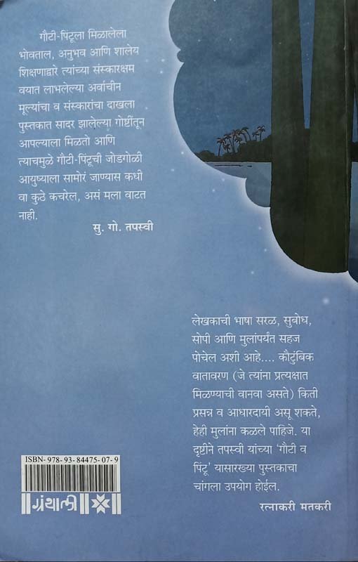 गौटी-पिंटूला मिळालेला भोवताल, अनुभव आणि शालेय शिक्षणाद्वारे त्यांच्या संस्कारक्षम वयात लाभलेल्या अर्वाचीन मुल्यांचा व संस्कारांचा दाखला पुस्तकात सादर झालेल्या गोष्टीतून आपल्याला मिळतो आणि त्याचमुळे गौटी-पिंटूची जोडगोळी आयुष्याला समोर जाण्यास कधी वा कुठे कचरेल, असं मला वाटत नाही.