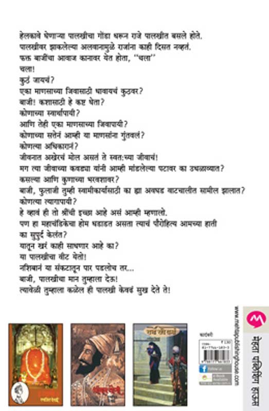 हेलकावे घेणाया पालखीचा गोंडा धरून राजे पालखीत बसले होते. पालखीवर झाकलेल्या अलवानामुळे राजांना काही दिसत नव्हतं. फक्त बाजींचा आवाज कानावर येत होता, ‘‘चला’’ चला! कुठं जायचं? एका माणसाच्या जिवासाठी धावायचं कुठवर? बाजी! कशासाठी हे कष्ट घेता? कोणाच्या स्वार्थापायी? आणि तेही एका माणसाच्या जिवापायी? कोणाच्या सत्तेनं आम्ही या माणसांना गुंतवलं? कोणत्या अधिकारानं? जीवनात अखेरचं मोल असतं ते स्वत:च्या जीवाचं! मग त्या जीवाच्या कवड्या यांनी आम्ही मांडलेल्या पटावर का उधळाव्यात? कसल्या आणि कुणाच्या भरवशावर? बाजी, फुलाजी तुम्ही स्वामीकार्यासाठी का ह्या अवघड वाटचालीत सामील झालात? कोणत्या त्यागापायी? हे व्हावं ही तो श्रींची इच्छा आहे असं आम्ही म्हणालो. पण हा महाचंडिकेचा होम धडाडत असता त्याचं पौरोहित्य आमच्या हाती का सुपुर्द केलंत? यातून खरं काही साधणार आहे का? या पालखीचा वीट येतो! नशिबानं या संकटातून पार पडलोच तर... बाजी, पालखीचा मान तुम्हाला देऊ! त्यावेळी तुम्हाला कळेल ही पालखी केवढं सुख देते ते!