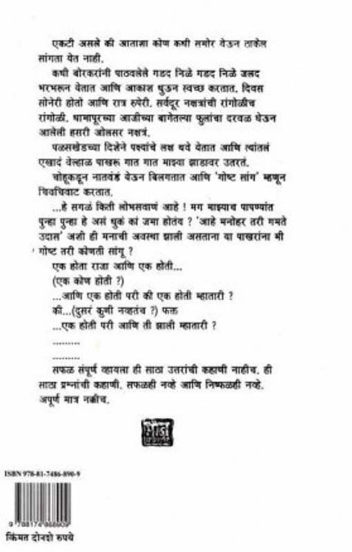 एकटी असले की आताशा कोण कधी समोर येऊन ठाकले सांगता येत नाही. कधी बोरकरांनी पाठवलेले गडद निळे गडद निळे जलद भरभरून येतात आणि आकाश धुऊन स्वच्छ करतात. दिवस सोनेरी होतो आणि रात्र रुपेरी. सर्वदूर नक्षत्रांची रांगोळीच रांगोळी. धामापूरच्या आजीच्या बागेतल्या फुलांचा दरवळ घेऊन आलेली हसरी ओलसर नक्षत्रं. पळसखेडच्या दिशेने पक्ष्यांचे लक्ष थवे येतात आणि त्यांतलं एखादं वेल्हाळ पाखरू गात गात माझ्या झाडावर उतरतं. चोहूकडून नातवंडं येऊन बिलगतात आणि ’गोष्ट सांग’ म्हणून चिवचिवाट करतात. ...हे सगळं किती लोभसवाणं आहे! मग माझ्याच पापण्यांत पुन्हा पुन्हा हे असं धुकं कां जमा होतंय?’ आहे मनोहर तरी गमते उदास’ अशी ही मनाची अवस्था झाली असताना या पाखरांना मी गोष्ट तरी कोणती सांगू? एक होता राजा आणि एक होती... (एक कोण होती?) ...आणि एक होती परी की एक होती म्हातारी? की... (दुसरं कुणी नव्हतंच?) फक्त ...एक होती परी आणि ती झाली म्हातारी? ..... .... सफळ संपूर्ण व्हायला ही साठा उत्तरांची कहाणी नाहीच. ही साठा प्रश्नांची कहाणी. सफळही नव्हे आणि निष्फळही नव्हे. अपूर्ण मात्र नक्कीच.