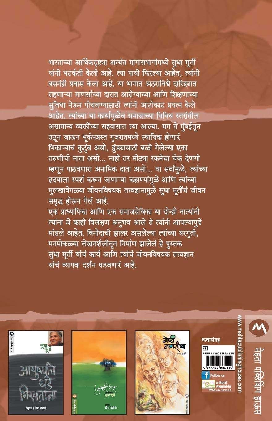 आपल्या व्यवसायात कार्यमग्न असतानाही सामाजिक भान ठेवून टिपलेल्या अनुभवांचे हे लेखन. भारताच्या आर्थिकदृष्ट्या अत्यंत मागासभागांमध्ये सुधा मूर्ती यांनी भटकंती केली आहे. त्या पायी फिरल्या आहेत, त्यांनी बसनंही प्रवास केला आहे. या भागात अठराविश्वे दारिद्र्यात राहणाऱ्या माणसांच्या दारात आरोग्याच्या आणि शिक्षणाच्या सुविधा नेऊन पोचवण्यासाठी त्यांनी आटोकाट प्रयत्न केले आहेत. त्यांच्या या कार्यामुळेच समाजाच्या विविध स्तरांतील असामान्य व्यक्तींच्या सहवासात त्या आल्या. मग ते मुंबईतून उठून जाऊन भूकंपग्रस्त गुजरातमध्ये स्थायिक होणारं भिकाऱ्यांचं कुटुंब असो, हुंड्यासाठी बळी गेलेल्या एका तरुणीची माता असो... नाही तर मोठ्या रकमेचा चेक देणगी म्हणून पाठवणारा अनामिक दाता असो... या सर्वांमुळे, त्यांच्या हृदयाला स्पर्श करून जाणाऱ्या कहाण्यांमुळे आणि त्यांच्या मुलखावेगळ्या जीवनविषयक तत्त्वज्ञानामुळे सुधा मूर्तींचं जीवन समृद्ध होऊन गेलं आहे.एक प्राध्यापिका आणि एक समाजसेविका या दोन्ही नात्यांनी त्यांना जे काही विलक्षण अनुभव आले ते त्यांनी आपल्यापुढे मांडले आहेत. विनोदाची झालर असलेल्या त्यांच्या घरगुती, मनमोकळ्या लेखनशैलीतून निर्माण झालेलं हे पुस्तक सुधा मूर्ती यांचं कार्य आणि त्यांचं जीवनविषयक तत्त्वज्ञान यांचं व्यापक दर्शन घडवणारं आहे.