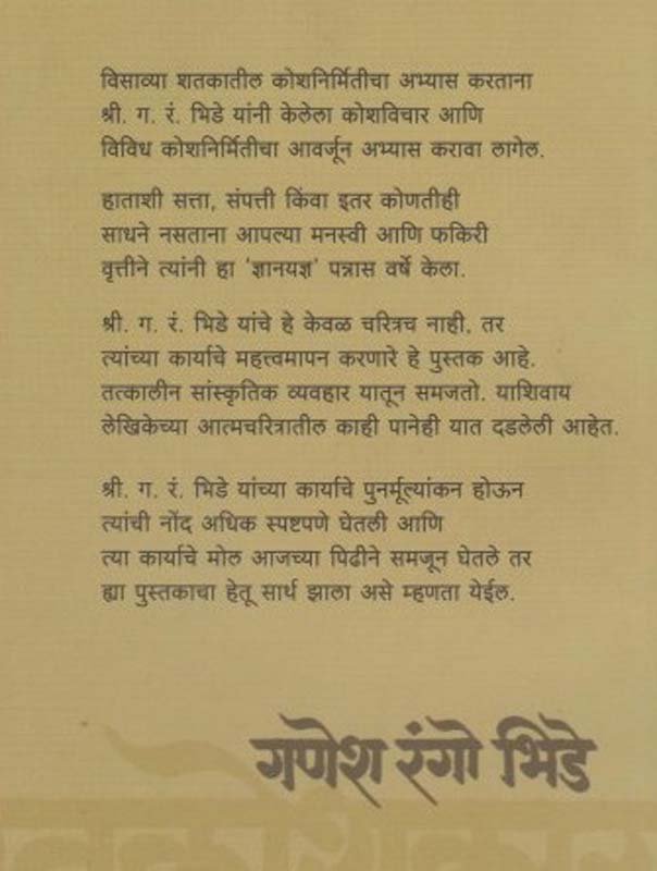 विसाव्या शतकातील कोशनिर्मितीचा अभ्यास करताना श्री. ग. रं. भिडे यांनी केलेला कोशविचार आणि विविध कोशनिर्मितीचा आवर्जून अभ्यास करावा लागेल. स्वातंत्र्यपूर्व काळात हाताशी सत्ता, संपत्ती किंवा इतर कोणतीही साधने नसताना आपल्या मनस्वी आणि फकिरी वृत्तीने त्यांनी हा ‘ज्ञानयज्ञ’ पन्नास वर्षे केला. श्री. ग. रं. भिडे यांचे हे केवळ चरित्रच नाही, तर त्यांच्या कार्याचे महत्त्वमापन करणारे हे पुस्तक आहे. तत्कालीन सांस्कृतिक व्यवहार यातून समजतो. याशिवाय लेखिकेच्या आत्मचरित्रातील काही पानेही यात दडलेली आहेत. श्री. ग. रं. भिडे यांच्या कार्याचे पुनर्मूल्यांकन होऊन त्यांची नोंद अधिक स्पष्टपणे घेतली आणि त्या कार्याचे मोल आजच्या पिढीने समजून घेतले तर ह्या पुस्तकाचा हेतू सार्थ झाला असे म्हणता येईल.
