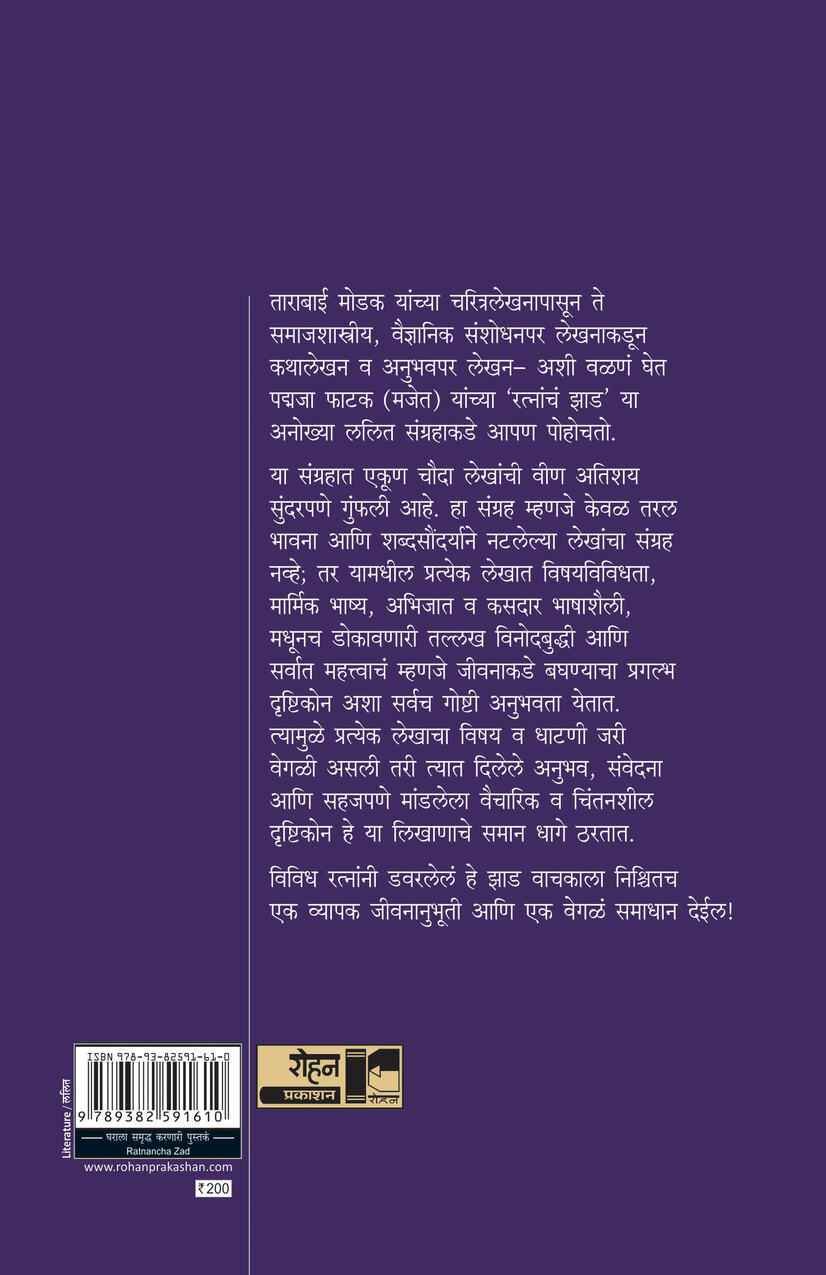 ताराबाई मोडक यांच्या चरित्रलेखनापासून ते समाजशास्त्रीय, वैज्ञानिक संशोधनपर लेखनाकडून कथालेखन व अनुभवपर लेखन- अशी वळणं घेत पद्मजा फाटक (मजेत) यांच्या 'रत्नांचं झाड' या अनोख्या ललित संग्रहाकडे आपण पोहोचतो.या संग्रहात एकूण चौदा लेखांची वीण अतिशय सुंदरपणे गुंफली आहे. हा संग्रह म्हणजे केवळ तरल भावना आणि शब्दसौंदर्याने नटलेल्या लेखांचा संग्रह नव्हे; तर यामधील प्रत्येक लेखात विषयविविधता, मार्मिक भाष्य, अभिजात व कसदार भाषाशैली, मधूनच डोकावणारी तल्लख विनोदबुद्धी आणि सर्वात महत्त्वाचं म्हणजे जीवनाकडे बघण्याचा प्रगल्भ दृष्टिकोन अशा सर्वच गोष्टी अनुभवता येतात. त्यामुळे प्रत्येक लेखाचा विषय व धाटणी जरी वेगळी असली तरी त्यात दिलेले अनुभव, संवेदना आणि सहजपणे मांडलेला वैचारिक व चिंतनशील दृष्टिकोन है या लिखाणाचे समान धागे ठरतात.विविध रत्नांनी डवरलेलं हे झाड वाचकाला निश्चितच एक व्यापक जीवनानुभूती आणि एक वेगळं समाधान देईल!
