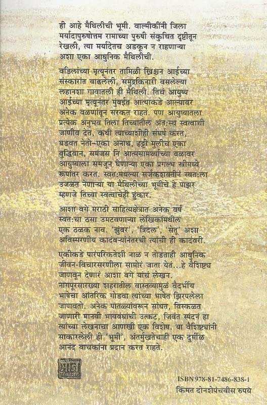 ही आहे मैथिलीची भूमी. वाल्मीकींनी जिला मर्यादापुरूषोत्तम रामाच्या पुरूषी संकुचित दॄष्टीतून रेखली, त्या मर्यादेतच अडकून न राहणा-या अशा एका आधुनिक मैथिलीची. वडिलांच्या मॄत्यूनंतर तमिळी ख्रिश्चन अईच्या संस्कारांत वाढलेली, समुद्रकिनारी वसलेल्या लहानशा गावातली ही मैथिली. तिचं आयुष्य आईच्या मॄत्यूनंतर मुंबईत आत्याकडे आल्यावर अनेक वळणांवर सरकत राहतं. पण आयुष्यातला प्रत्येक अनुभव तिला तिच्यातील अंत:स्थ स्वत्वाची जाणीव देत, कधी त्याच्याशीही संघर्ष करत, घडवत नेतो-एका अनाथ, हट्टी मुलीचं एका बुद्धिवान, समंजस नि आत्मसामथर्याच्या वळावर आयुष्याला समजून घेणा-या एका प्रगल्भ स्त्रीमध्ये रूपांतर करत. स्वत:मधल्या सर्जकशक्तीनं स्वत:ला उजळत नेणा-या या मैथिलीच्या भूमीचे हे पाझर म्हणजे तिच्या स्वत्वाचेही हुंकार. आशा बगे मराठी साहित्यक्षेत्रात अनेक वर्षं स्वत:चा ठसा उमटवणा-या लेखिकांमधील एक ठळक नाव. ’झुंबर’, ’त्रिदल’, ’सेतू’ अशा अविस्मरणीय कादंब-यांनंतरची त्यांची ही कादंबरी. एकीकडे पारंपारिकतेशी नाळ न तोडताही आधुनिक जीवन-विचारसरणीला सामोरं जाता येतं... हे वैशिष्टय जाणवून देणारं आशा बगे यांचं लेखन. नागापूरसारख्या शहरांतील वास्तव्यामुळं वैदर्भीय भाषेचा आंतरिक गोडवा त्यांच्या भाषेत झिरपलेला जाणवतो. अनेक पातळयांवरून सांधत, विस्कळत जाणारी मानवी भावबंधांची उत्कट, जिवंत स्पंदन हा त्यांच्या लेखनाचा आणखी एक विशेष. या वैशिष्टयांनी सोकारलेली ही ’भूमी’, अंतर्मुखतेचाही एक दुर्मीळ आनंद वाचकांना प्रदान करत राहते.
