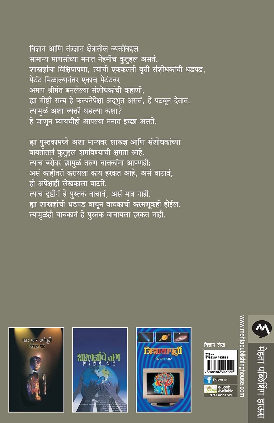 विज्ञान आणि तंत्रज्ञान क्षेत्रातील व्यक्तीबद्दल सामान्य माणसांच्या मनात नेहमीच कुतुहल असतं. शास्त्रज्ञांचा विक्षिप्तपणा, त्यांची एककल्ली वृत्ती संशोधकांची धडपड, •पेटंट मिळाल्यानंतर एकाच पेटंटवर अमाप श्रीमंत बनलेल्या संशोधकांची कहाणी, ह्या गोष्टी सत्य हे कल्पनेपेक्षा अद्भुत असतं, हे पटवून देतात. हे . त्यामुळे अशा व्यक्ती घडल्या कशा?हे जाणून घ्यायचीही आपल्या मनात इच्छा असते.ह्या पुस्तकामध्ये अशा मान्यवर शास्त्रज्ञ आणि संशोधकांच्या बाबतीतलं कुतुहल शमविण्याची क्षमता आहे. त्याच बरोबर ह्यामुळं तरुण वाचकांना आपणही; असं काहीतरी करायला काय हरकत आहे, असं वाटावं, ही अपेक्षाही लेखकाला वाटते. त्याच दृष्टीनं हे पुस्तक वाचावं, असं मात्र नाही. ह्या शास्त्रज्ञांची धडपड वाचून वाचकाची करमणूकही होईल.त्यामुळंही वाचकानं हे पुस्तक वाचायला हरकत नाही.