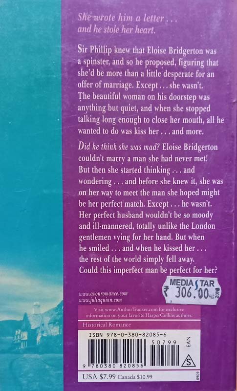 She wrote him a letter...and he stole her heart. Sir Phillip knew that Eloise Bridgerton was a spinster, and so he’d proposed, figuring that she’d be homely and unassuming, and more than a little desperate for an offer of marriage. Except . . . she wasn’t. The beautiful woman on his doorstep was anything but quiet, and when she stopped talking long enough to close her mouth, all he wanted to do was kiss her . . . and more. Did he think she was mad? Eloise Bridgerton couldn’t marry a man she had never met! But then she started thinking . . . and wondering . . . and before she knew it, she was in a hired carriage in the middle of the night, on her way to meet the man she hoped might be her perfect match. Except . . . he wasn’t. Her perfect husband wouldn’t be so moody and ill-mannered, and while Phillip was certainly handsome, he was a large brute of a man, rough and rugged, and totally unlike the London gentlemen vying for her hand. But when he smiled . . . and when he kissed her . . . the rest of the world simply fell away, and she couldn’t help but wonder . . . could this imperfect man be perfect for her?