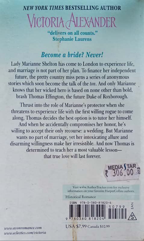 Never Tempt a Lady Become a bride? Never! Lady Marianne Shelton has come to London to experience life, and marriage is not part of her plan. To finance her independent future, the pretty country miss pens a series of anonymous stories. Soon they are the talk of the ton-and only she knows that her wicked hero is based on none other than bold, brash Thomas Effington, the future Duke of Roxborough. Never Deny a Marquess, Thomas has been thrust into le of Marianne's protector. When she threatens to experience life with the first willing rogue to come along, he decides the best recourse is to tutor her himself. And when he accidentally compromises her honor, he's willing to accept their only recourse: a wedding. Marianne claims she wants no part of marriage, but her intoxicating allure and disarming willingness make her irresistible. And now Thomas is determined to teach her a lesson: that true love will last forever.