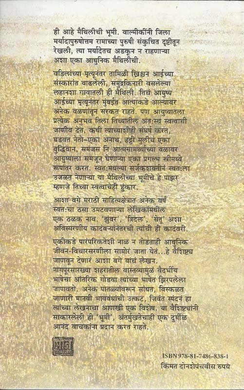 ही आहे मैथिलीची भूमी. वाल्मीकींनी जिला मर्यादापुरूषोत्तम रामाच्या पुरूषी संकुचित दॄष्टीतून रेखली, त्या मर्यादेतच अडकून न राहणा-या अशा एका आधुनिक मैथिलीची. वडिलांच्या मॄत्यूनंतर तमिळी ख्रिश्चन अईच्या संस्कारांत वाढलेली, समुद्रकिनारी वसलेल्या लहानशा गावातली ही मैथिली. तिचं आयुष्य आईच्या मॄत्यूनंतर मुंबईत आत्याकडे आल्यावर अनेक वळणांवर सरकत राहतं. पण आयुष्यातला प्रत्येक अनुभव तिला तिच्यातील अंत:स्थ स्वत्वाची जाणीव देत, कधी त्याच्याशीही संघर्ष करत, घडवत नेतो-एका अनाथ, हट्टी मुलीचं एका बुद्धिवान, समंजस नि आत्मसामथर्याच्या वळावर आयुष्याला समजून घेणा-या एका प्रगल्भ स्त्रीमध्ये रूपांतर करत. स्वत:मधल्या सर्जकशक्तीनं स्वत:ला उजळत नेणा-या या मैथिलीच्या भूमीचे हे पाझर म्हणजे तिच्या स्वत्वाचेही हुंकार. आशा बगे मराठी साहित्यक्षेत्रात अनेक वर्षं स्वत:चा ठसा उमटवणा-या लेखिकांमधील एक ठळक नाव. ’झुंबर’, ’त्रिदल’, ’सेतू’ अशा अविस्मरणीय कादंब-यांनंतरची त्यांची ही कादंबरी. एकीकडे पारंपारिकतेशी नाळ न तोडताही आधुनिक जीवन-विचारसरणीला सामोरं जाता येतं... हे वैशिष्टय जाणवून देणारं आशा बगे यांचं लेखन. नागापूरसारख्या शहरांतील वास्तव्यामुळं वैदर्भीय भाषेचा आंतरिक गोडवा त्यांच्या भाषेत झिरपलेला जाणवतो. अनेक पातळयांवरून सांधत, विस्कळत जाणारी मानवी भावबंधांची उत्कट, जिवंत स्पंदन हा त्यांच्या लेखनाचा आणखी एक विशेष. या वैशिष्टयांनी सोकारलेली ही ’भूमी’, अंतर्मुखतेचाही एक दुर्मीळ आनंद वाचकांना प्रदान करत राहते.