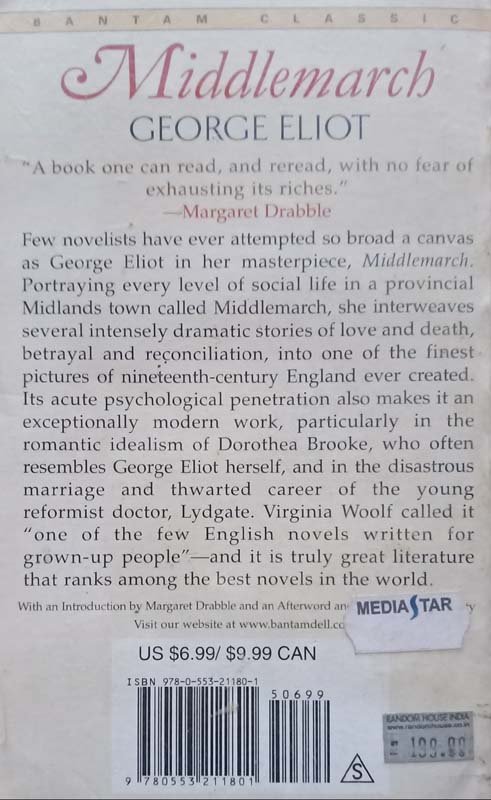 Few novelists have ever attempted so broad a canvis as George Eliot in her masterpiece, Middlemarch. Portraying every level of social life in a provincial Midlands town called Middlemarch, she interweaves several intensely dramatic stories of love and death, betrayal and reconciliation, into one of the finest pictures of nineteenth-century England ever created Its acute psychological penetration also makes it exceptionally modern work, particularly in t romantic idealism of Dorothea Brooke, who oft resembles George Eliot herself, and in the disastros marriage and thwarted career of the you g reformist doctor, Lydgate. Virginia Woolf called t "one of the few English novels written for grown-up people"-and it is truly great literature that ranks among the best novels in the world.