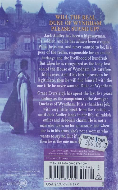 Jack Audley has been a highwayman, a soldier, and he has always been a rogue. What he is not, and never wanted to be, is a peer of the realm. But when he is recognised as the long-lost son of the House of Wyndham, his carefree life is over. And if his birth proves to be legitimate, then he will find himself with the one title he never wanted: Duke of Wyndham. Grace Eversleigh has spent the last five years toiling as the companion to the dowager Duchess of Wyndham. It is a thankless job, with very little break from the routine...until Jack Audley lands in her life, all rakish smiles and debonair charm. He is not a man who takes no for an answer, and when she is in his arms, she's not a woman who wants to say no. But if he is the true duke, then he is the one man she can never have...