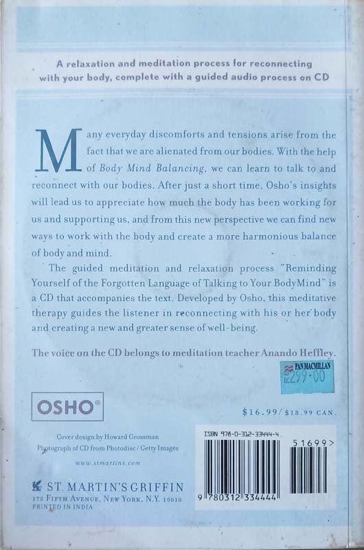Many everyday discomforts and tensions arise from the fact that we are alienated from our bodies. With the help of Osho’s Body Mind Balancing, readers will learn to talk to and reconnect with their bodies. After just a short time, readers will begin to appreciate how much the body has been working for them and supporting them, and from this new perspective one can find new ways to work with the body and create a more harmonious balance of body and mind. Accompanying the book is a CD featuring the meditative therapy “Reminding Yourself of the Forgotten Language of Talking to Your BodyMind,” spoken by meditation teacher Anando Hefley. Developed by Osho, it guides the listener in reconnecting with his or her body and creating a new and greater sense of well-being.