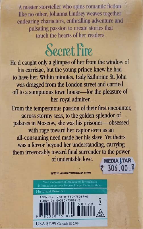 A master storyteller who spins romantic fiction like not other, Johanna Lindsey weaves together endearing characters, enthralling adventure and pulsating passion to create stories that touch the hearts of her readers. Secret Fire He'd caught only a glimpse of her from the window of his carriage, but the young prince knew he had to have her. Within minutes, Lady Katherine St. John was dragged from the London street and carried off to a sumptuous town house -- for the pleasure of her royal admirer... From the tempestuous passion of their first encounter, across stormy seas, to the golden splendor of palaces in Moscow, she was his prisoner -- obsessed with rage toward her captor even as an all-consuming need made her his slave. Yet theirs was a fervor beyond her understanding, carrying them irrevocably toward final surrender to the power of undeniable love.