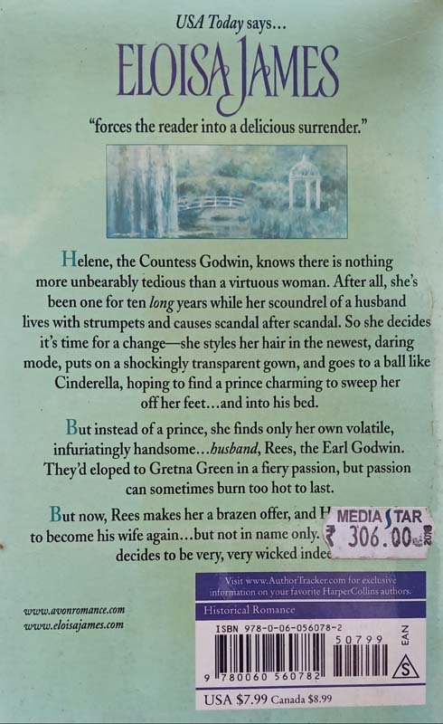 Helene, the Countess Godwin, knows there is nothing more unbearably tedious than a virtuous woman. After all, she's been one for ten long years while her scoundrel of a husband lives with strumpets and causes scandal after scandal. So she decides it's time for a change -- she styles her hair in the newest, daring mode, puts on a shockingly transparent gown, and goes to a ball like Cinderella, hoping to find a prince charming to sweep her off her feet...and into his bed. But instead of a prince, she finds only her own volatile, infuriatingly handsome...husband, Rees, the Earl Godwin. They'd eloped to Gretna Green in a fiery passion, but passion can sometimes burn too hot to last. But now, Rees makes her a brazen offer, and Helene decides to become his wife again...but not in name only. No, this time she decides to be very, very wicked indeed.