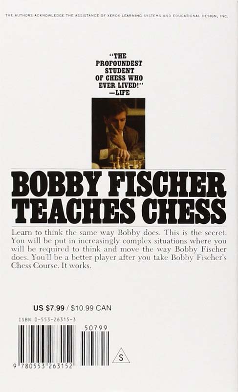 Bobby Fischer Teaches Chess is a well-presented book for beginners in chess. It contains various puzzles, along with clear instructions, can help readers learn how to play chess quickly and efficiently. Bobby Fischer Teaches Chess follows a flowchart-like pattern. This teaching machine was made according to the principles of programmed learning, and is filled with checkmate puzzles. At every step, the authors asks you a question. The right answer takes you to the next question, whereas the incorrect answer takes you to an explanation. Readers will find themselves in complex situations, and they will have to come up with solutions and moves on the chessboard, like Bobby Fischer used to. Eighteen of the puzzles in Bobby Fischer Teaches Chess are based on positions of Fischer's games. This guidebook will teach you how to analyse chess problems, and look for themes in order to make the right moves. The book contains a section titled A Word From Bobby. The introduction explains how to play chess. Some of the chapters in this book are Elements of Checkmate, Displacing Defenders, and Attacks on the Enemy Pawn Cover. Readers will also come across diagrams which make it easier for them to understand the concepts. The reissue edition, published by RHUS in 1982, is available in paperback.