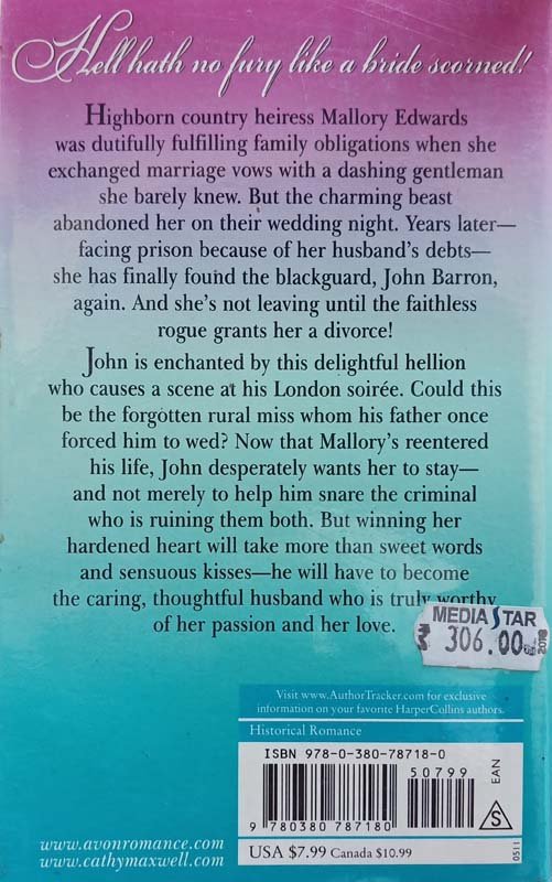 Hell hath no fury like a bride scorned! Highborn country heiress Mallory Edwards was dutifully fulfilling family obligations when she exchanged marriage vows with a dashing gentleman she barely knew. But the charming beast abandoned her on their wedding night. Years later—facing prison because of her husband's debts—she has finally found the blackguard, John Barron, again. And she's not leaving until the faithless rogue grants her a divorce! John is enchanted by this delightful hellion who causes a scene at his London soirée. Could this be the forgotten rural miss whom his father once forced him to wed? Now that Mallory's reentered his life, John desperately wants her to stay—and not merely to help him snare the criminal who is ruining them both. But winning her hardened heart will take more than sweet words and sensuous kisses—he will have to become the caring, thoughtful husband who is truly worthy of her passion and her love.