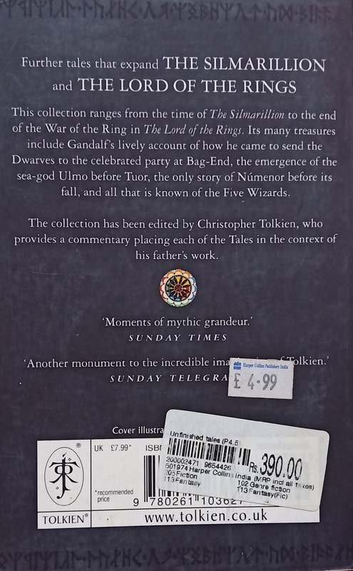 Unfinished Tales of Númenor and Middle-earth concentrates on the lands of Middle-earth and comprises Gandalfs lively account of how he came to send the Dwarves to the celebrated party at Bag-End, the story of the emergence of the sea god Ulmo before the eyes of Tuor on the coast of Beleriand, and an exact description of the military organization of the Riders of Rohan and the journey of the Black Riders during the hunt for the Ring. It also contains the only surviving story about the long ages of Númenor before its downfall, and all that is known about the Five Wizards sent to Middle-earth as emissaries of the Valar, about the Seeing Stones known aspalantíri, and about the legend of Amroth.