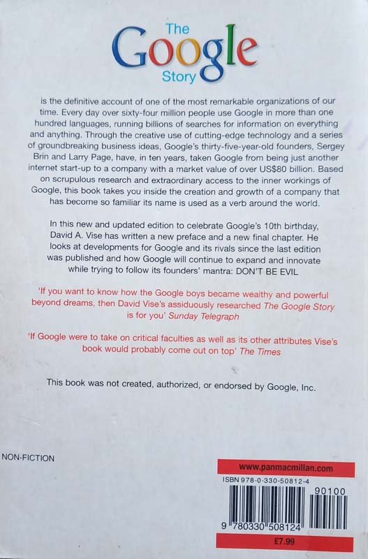 The Google Story is the definitive account of one of the most remarkable organizations of our time. Every day over sixty-four million people use Google in more than one hundred languages, running billions of searches for information on everything and anything. Through the creative use of cutting-edge technology and a series of groundbreaking business ideas, Google's thirty-five year old founders, Sergey Brin and Larry Page, have in ten years taken Google from being just another internet start-up to a company with a market value of over US$80 billion. Based on scrupulous research and extraordinary access to the inner workings of Google, this book takes you inside the creation and growth of a company that has become so familiar its name is used as a verb around the world. But even as it rides high, Google wrestles with difficult challenges in a business that changes at lightning speed. In this new and updated edition to celebrate Google’s 10th birthday, David A. Vise has written a new preface and new final chapter which look at further developments since 2005 and how Google will continue to expand and innovate while trying to follow its founders' mantra: DO NO EVIL 'If you want to know how the Google boys became wealthy and powerful beyond dreams, then David Vise's assiduously researched The Google Story is for you.' Sunday Telegraph 'If Google were to take on critical faculties as well as its other attributes Vise's book would probably come out on top.' The Times