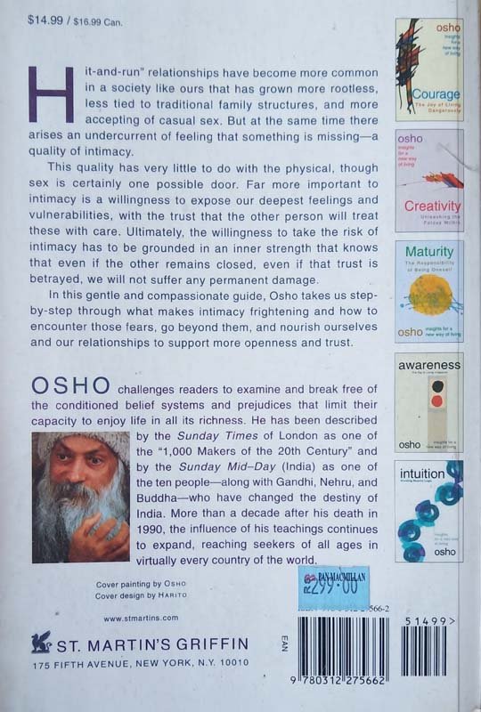 “Hit-and-run” relationships have become common in our society as it has grown more rootless, less tied to traditional family structures, and more accepting of casual sex. But at the same time, there arises an undercurrent of feeling that something is missing―a quality of intimacy. This quality has very little to do with the physical, though sex is certainly one possible door. Far more important is a willingness to expose our deepest feelings and vulnerabilities, with the trust that the other person will treat them with care. Ultimately, the willingness to take the risk of intimacy has to be grounded in an inner strength that knows that even if the other remains closed, even if that trust is betrayed, we will not suffer any permanent damage. In this gentle and compassionate guide, Osho takes his readers step-by-step through what makes people afraid of intimacy, how to encounter those fears and go beyond them, and what they can do to nourish themselves and their relationships to support more openness and trust.Osho challenges readers to examine and break free of the conditioned belief systems and prejudices that limit their capacity to enjoy life in all its richness. He has been described by the Sunday Times of London as one of the “1000 Makers of the 20th Century” and by Sunday Mid-Day (India) as one of the ten people―along with Gandhi, Nehru, and Buddha―who have changed the destiny of India. Since his death in 1990, the influence of his teachings continues to expand, reaching seekers of all ages in virtually every country of the world.