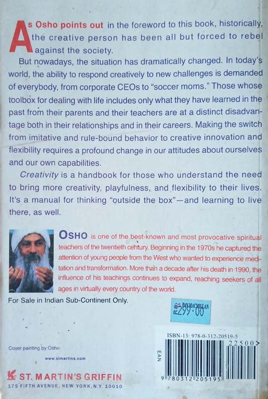As Osho points out in this book’s foreword, historically, the creative person has been all but forced to rebel against the society. But nowadays, the situation has dramatically changed. In today’s world, the ability to respond creatively to new challenges is demanded of everybody, from corporate CEOs to “soccer moms.” Those whose toolbox for dealing with life includes only what they have learned in the past from their parents and their teachers are at a distinct disadvantage both in their relationships and in their careers. Making a switch from imitative and rule-bound behavior to creative innovation and flexibility requires a profound change in our attitudes about ourselves and our capabilities. Creativity is a handbook for those who understand the need to bring more creativity, playfulness, and flexibility to their lives. It’s a manual for thinking “outside the box”―and learning to live there as well.
