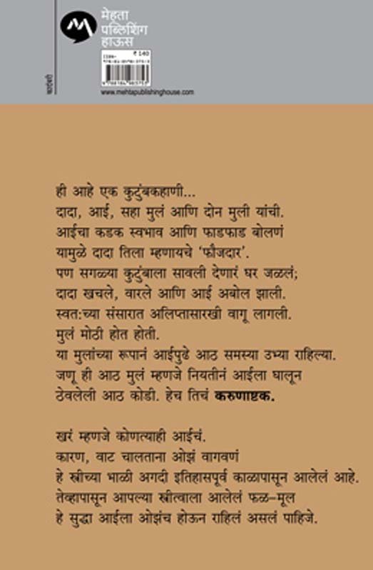 ही आहे एक कुटुंबकहाणी... दादा, आई, सहा मुलं आणि दोन मुली यांची. आईचा कडक स्वभाव आणि फाडफाड बोलणं यामुळे दादा तिला म्हणायचे ‘फौजदार’. पण सगळ्या कुटुंबाला सावली देणारं घर जळलं; दादा खचले, वारले आणि आई अबोल झाली. स्वत:च्या संसारात अलिप्तासारखी वागू लागली. मुलं मोठी होत होती. या मुलांच्या रूपानं आईपुढे आठ समस्या उभ्या राहिल्या. जणू ही आठ मुलं म्हणजे नियतीनं आईला घालून ठेवलेली आठ कोडी. हेच तिचं करुणाष्टक. खरं म्हणजे कोणत्याही आईचं. कारण, वाट चालताना ओझं वागवणं हे स्त्रीच्या भाळी अगदी इतिहासपूर्व काळापासून आलेलं आहे. तेव्हापासून आपल्या स्त्रीत्वाला आलेलं फळ–मूल हे सुद्धा आईला ओझंच होऊन राहिलं असलं पाहिजे.