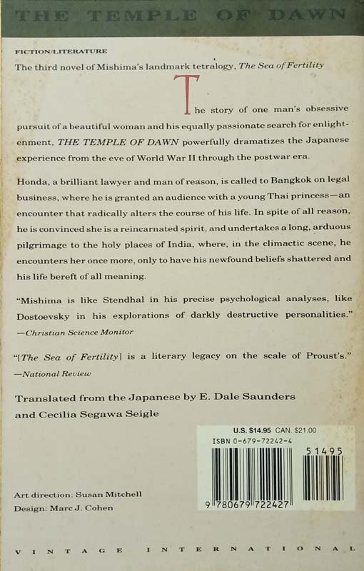 Mishima’s literary powers are on full display in his penultimate novel that is a meditation on reincarnation and Buddhist philosophy. Honda, a brilliant lawyer and man of reason, is called to Bangkok on legal business, where he is granted an audience with a young Thai princess - an encounter that radically alters the course of his life. He is convinced she is a reincarnated spirit, and undertakes a long, arduous pilgrimage to the holy places of India, where, in the climactic scene, he encounters her once more, only to have his newfound beliefs shattered and his life bereft of all meaning.