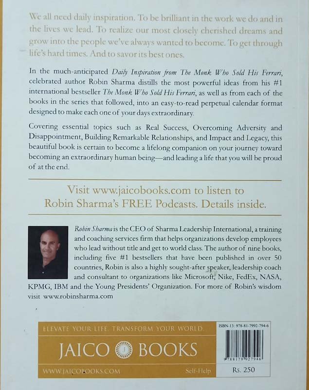 Daily Inspiration, written by Robin Sharma, is an extensive, heartfelt collection of quotes borrowed from his bestseller, The Monk Who Sold His Ferrari and some of his other writings as well. These quotes inspire you into looking at the larger picture in life. Being a virtual calendar of sorts, the author advises the readers to go through the book in a one-day-a-quote pattern. This book offers a fresh perspective on worldly actions and helps readers in understanding the underlying essence of existence and survival. The book urges people to self-evaluate so that they can grasp the innate purpose of their lives. Furthermore, it stresses on learning to think beyond the monotony of daily life. It advises readers to look at each day in a positive light and as an opportunity for learning new things. Motivating readers to achieve a fine balance between professional and personal lives, the quotes in this book help individuals in becoming better human beings. Bringing much-needed principles and ethics into perspective, the book counsels its readers to uncomplicated situations. According to the book, hard-learnt lessons should not be ignored for momentary pleasures. The first edition of Daily Inspiration was published by Jaico Publishing House in 2007. It is available in paperback format.