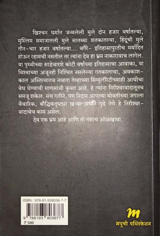ख्रिश्चन धर्मात जन्मलेली मुले दोन हजार वर्षातल्या, मुस्लिम समाजातली मुले सातव्या शतकातल्या, हिंदूंची मुले तीन-चार हजार वर्षातल्या... वगैरे-इतिहासापुरतीच मर्यादित होऊन राहायची नसतील तर त्यांना देव हा भ्रम नाकारावाच लागेल. या पृथ्वीच्या साडेचारशे कोटी वर्षाच्या इतिहासाचा आवाका, या विश्वाच्या अजूनही निश्चित नसलेल्या गतकालाचा, अवकाश काल असित्वातच नव्हता तेव्हाच्या सिंग्युलॅरिटीच्याही आधीचा वेध घेण्याची माणसांची कुवत आहे. हे त्यांना निरीश्वरवादातूनच समजू शकेल. संथ गतीने, पण निदान आपल्या भोवतीच्या जगाला वैचारिक, बौद्धिकदृष्ट्या खर्या अर्थाने पुढे नेणे हे निरीश्वरवादाचे काम असेल. देव एक भ्रम आहे आणि तो तसाच ओळखावा.