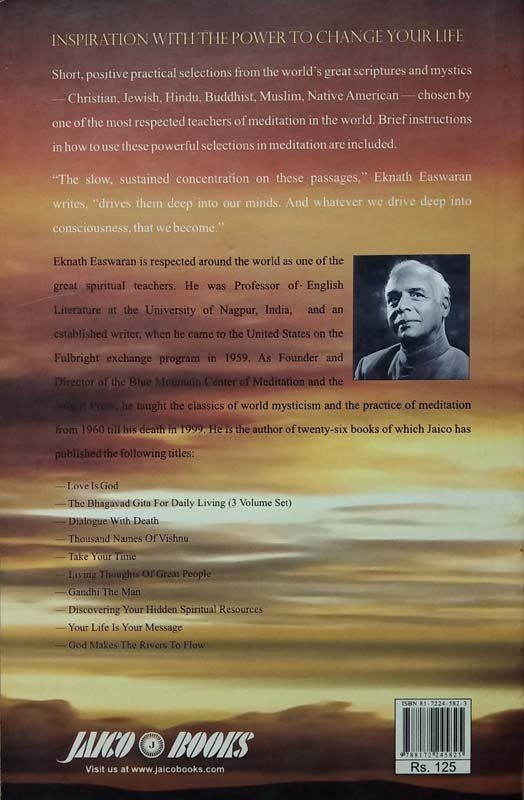 This book is a short, positive, practical selections from the world’s great scriptures and mystics – Christian, Jewish, Hindus, Buddhists, Muslim, Native American chosen by one of the most respected teachers of meditation in the world today. Brief instructions on how to use these powerful selections in meditation are included. The slow, sustained concentration on these passages, “Eknath Easwaran writes,” drives them deep into our minds. And whatever we drive deep into consciousness that we become.
