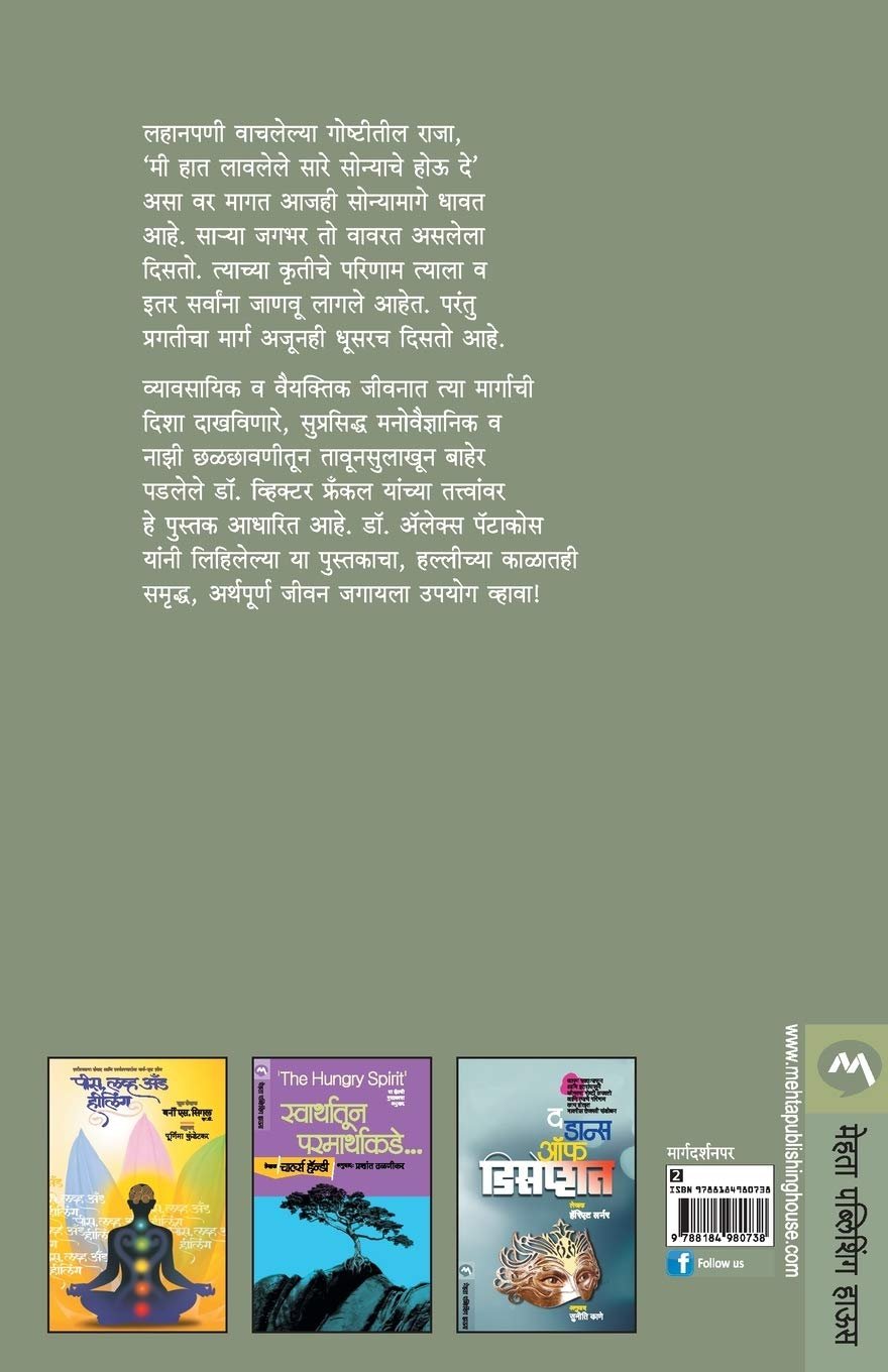 लहानपणी वाचलेल्या गोष्टीतील राजा, `मी हात लावलेले सारे सोन्याचे होऊ दे` असा वर मागत आजही सोन्यामागे धावत आहे. सा-या जगभर तो वावरत असलेला दिसतो. त्याच्या कृतीचे परिणाम त्याला व इतर सर्वांना जाणवू लागले आहेत. परंतु प्रगतीचा मार्ग अजूनही धूसरच दिसतो आहे. व्यावसायिक व वैयक्तिक जीवनात त्या मार्गाची दिशा दाखविणारे, सुप्रसिद्ध मनोवैज्ञानिक व नाझी छळछावणीतून तावूनसुलाखून बाहेर पडलेले डॉ. व्हिक्टर फ्रंकल यांच्या तत्त्वांवर हे पुस्तक आधारित आहे. डॉ. अॅलेक्स पटाकोस यांनी लिहिलेल्या या पुस्तकाच्या, हल्लीचा काळातही समृद्ध, अर्थपूर्ण जीवन जगायला उपयोग व्हावा!