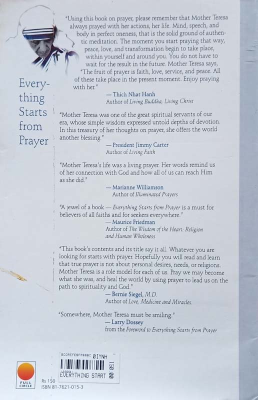 "Using this book on prayer, please remember that Mother Teresa always prayed with her actions, her life. Mind, speech and body in perfect oneness, that is the solid ground of authentic meditation. The moment you star praying that way, peace, love and transformation begin to take place, within yourself and around you. You do not have to wait for the result in the future. Mother Teresa says, "The fruit of prayer is faith, love, service and peace. All of these take place in the present moment. Enjoy praying with her." - Thich Nhat Hanh, Author of Living Buddha, Living Christ "Mother Teresa was one of the great spiritual servants of our era, whose simple wisdom expressed untold depths of devotion. In this treasury of her thoughts on prayer, she offers the world another blessing." - President Jimmy Carter, Author of Living Faith "Mother Teresa's life was a living prayer. Her words remind us of her connection with God and how all of us can reach Him as she did." - Marianne Williamson, Author of Illuminated Prayers "A jewel of a book - Everything Starts from Prayer is a must for believers of all faiths and for seekers everywhere." - Maurice Friedman, Author of The Wisdom of the Heart: Religion and Human wholeness "This book's contents and its title say it all. Whatever you are looking for starts with prayer. Hopefully you will read and learn that true prayer is not about personal desires, needs or religions. Mother Teresa is a role model for each of us. Pray we may become what she was and heal the world by using prayer to lead us on the path to spirituality and God." - Bernie Siegel, M.D., Author of Love, Medicine and Miracles. "Somewhere, Mother Teresa must be smiling." Larry Dossey, From the Foreword to Everything Starts from Prayer