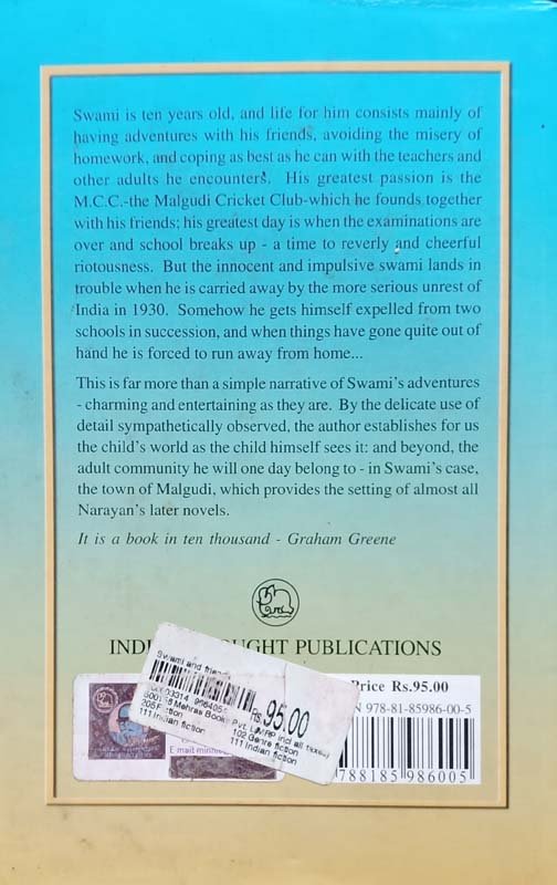Swami is ten years old, and life for him consists mainly of having adventures with his friends, avoiding the misery of homework, and coping as best as he can with the teachers and other adults he encounters. His greatest passion is the M CC - the Malgudi Cricket Club - which he founds together with his friends: his greatest day is when the examinations are over and school breaks up - a time for revelry and cheerful ritousness. But the innocent and impulsive Swami lands in trouble when he is carried away by the more serious unrest of India in 1930. Somehow he gets himself expelled from two schools in succession, and when things have gone quite out of hand he is forced to run away from home ... This is far more than a simple narrative of Swami's adventures - charming and entertaining as they are. By the delicate sympathetically observed, the author establishes for us the child's world as the child himself sees it: and beyond, the adult community he will one day belong to - in Swami's case, the town of Malgudi,which provides the setting of almost all Narayan's later novels.