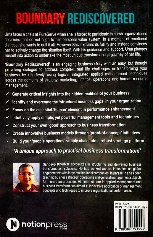 Uma faces a crisis at PureServe when she is forced to participate in harsh organizational decisions that do not align to her personal value system. In a moment of emotional distress, she wants to quit it all. However Shiv explains its futility and instead convinces her to actively change the situation itself. With his guidance and support, Uma plunges herself into action to undertake the most unique transformational journey of her life. ‘Boundary Rediscovered’ is an engaging business story with an easy, but thought provoking dialogue to address complex, real life challenges in transforming your business by effectively using logical, integrated applied management techniques across the domains of strategy, marketing, finance, operations and human resource management. Generate critical insights into the hidden realities of your business Identify and overcome the ‘structural business gaps’ in your organization Focus on the essential ‘human’ element in performance enhancement Intuitively apply simple, yet powerful management tools and techniques Construct your own ‘good’ approach to business transformation Create innovative business models through ‘proof-of-concept’ initiatives Build your ‘people operations’ supply chain into a robust strategy platform