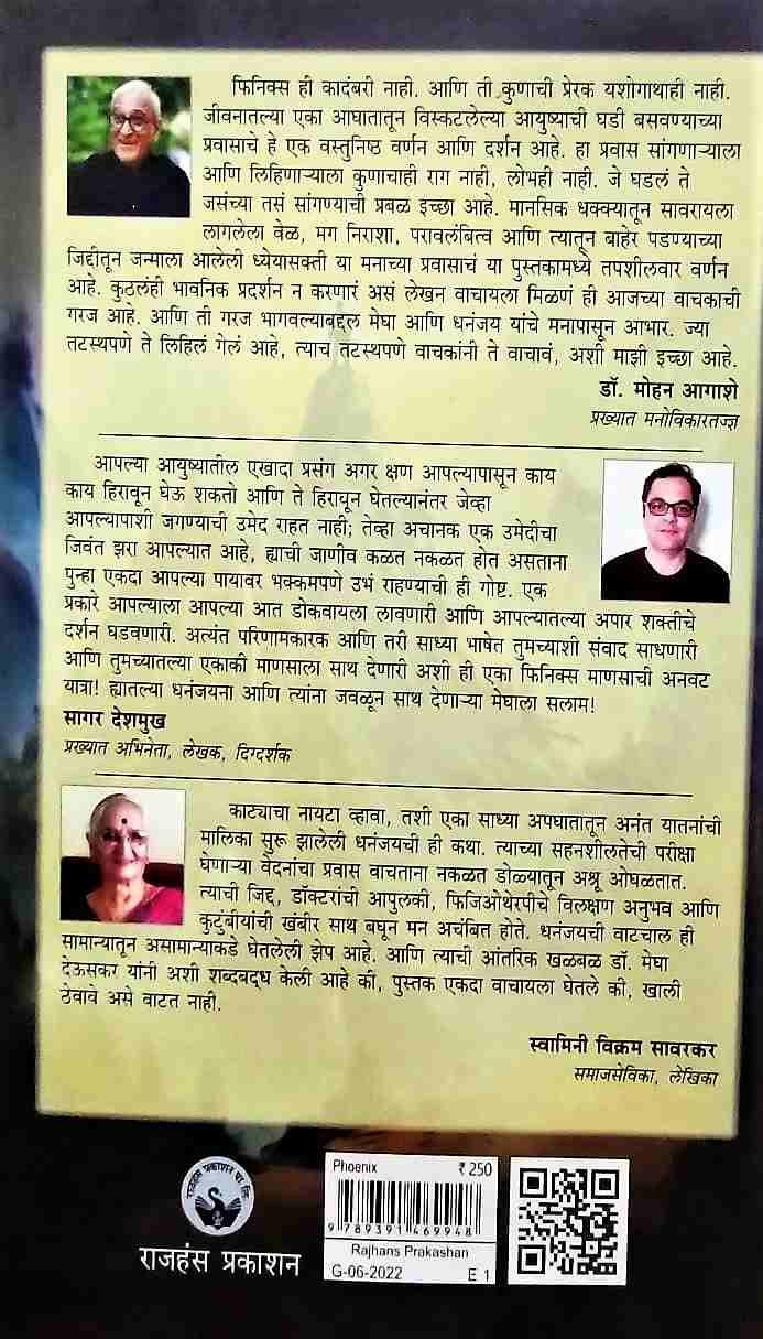 फिनिक्स ही कादंबरी नाही. आणि ती कुणाची प्रेरक यशोगाथाही नाही. जीवनातल्या एका आघातातून विस्कटलेल्या आयुष्याची घडी बसवण्याच्या प्रवासाचे हे एक वस्तुनिष्ठ वर्णन आणि दर्शन आहे. हा प्रवास सांगणाऱ्याला आणि लिहिणाऱ्याला कुणाचाही राग नाही. लोभही नाही. जे घडलं ते जसंच्या तसं सांगण्याची प्रबळ इच्छा आहे. मानसिक धक्क्यातून सावरायला लागलेला वेळ, मग निराशा, परावलंबित्व आणि त्यातून बाहेर पडण्याच्या जिद्दीतून जन्माला आलेली ध्येयासक्ती या मनाच्या प्रवासाचं या पुस्तकामध्ये तपशीलवार वर्णन आहे. कुठलंही भावनिक प्रदर्शन न करणारं असं लेखन वाचायला मिळणं ही आजच्या वाचकाची गरज आहे.