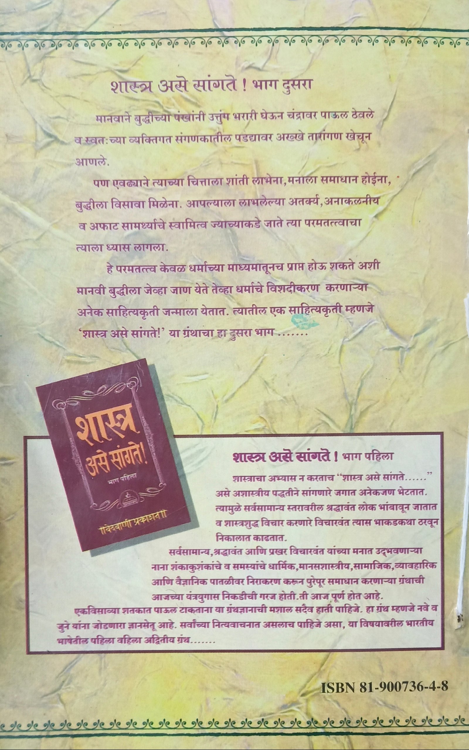 मानवाने बुद्धीच्या पंखांनी उत्तुंग भरारी घेऊन चंद्रावर पाऊल ठेवले व स्वतःच्या व्यक्तिगत संगणकातील पडद्यावर अख्खे तारांगण खेचून आणले. पण एवढ्याने त्याच्या चित्ताला शांती लाभेल मनाला समाधान होईना, बुद्धीला विसावा मिळेना आपल्याला लाभलेल्या अनाकलनीय व अफाट सामर्थ्याचे स्वामीत्व ज्याच्याकडे जाते त्या परमत्वाचा त्याला ध्यास लागला. हे परमत्व केवळ धर्माच्या माध्यमातूनच प्राप्त होऊ शकते अशी मानवी बुद्धीला जेव्हा जाण येते तेव्हा धर्माचे विशदीकरण करणाऱ्या अनेक साहित्यकृती जन्माला येतात. त्यातील एक साहित्यकृती म्हणजे "शास्त्र असे सांगते" या ग्रंथाचा हा दुसरा भाग.....